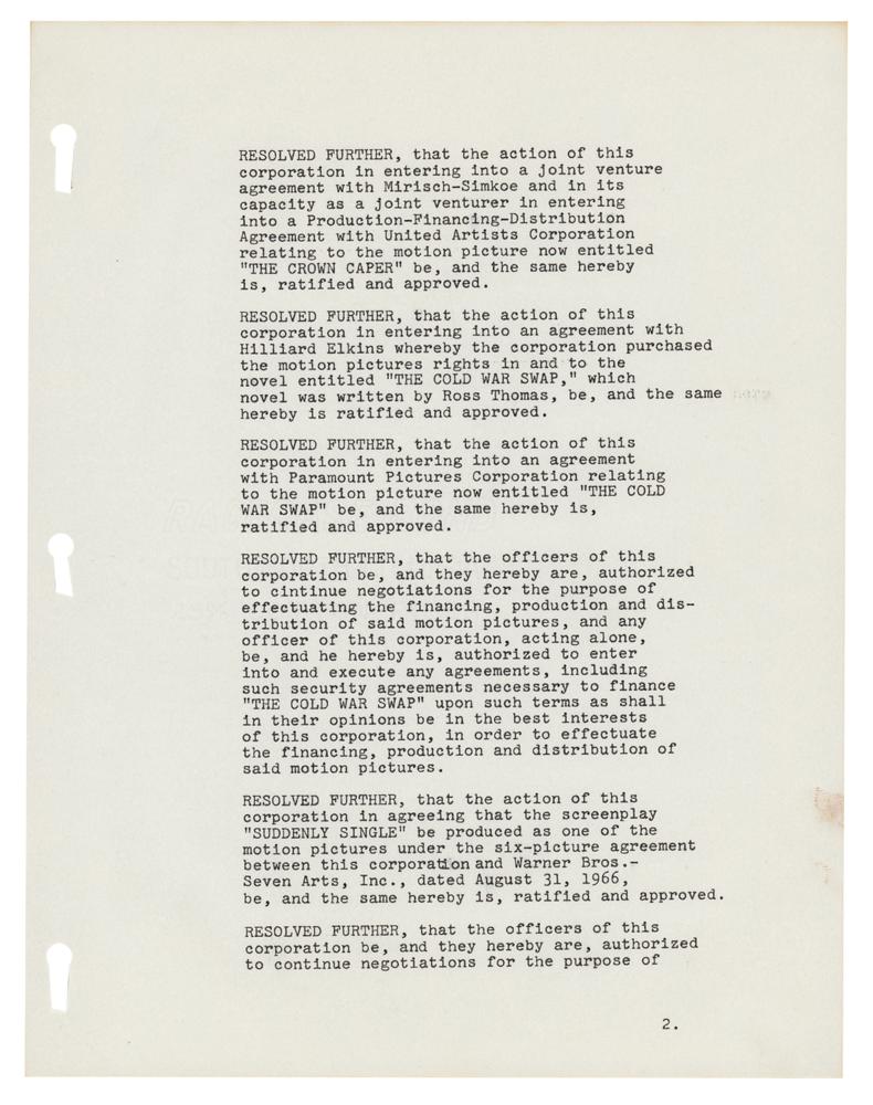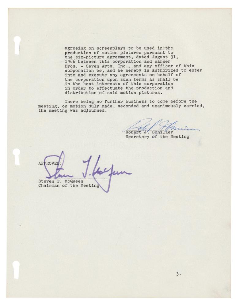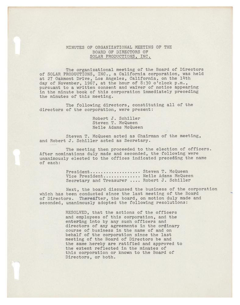DS, signed “Steven T. McQueen,” three pages, 8.5 x 11, November 14, 1967. Document headed "Minutes of Special Meeting of Board of Directors of Solar Productions, Inc.," making reference to the production and financing of several films, including "The Crown Caper," "The Cold War Swap," and "Suddenly Single." In fine condition.