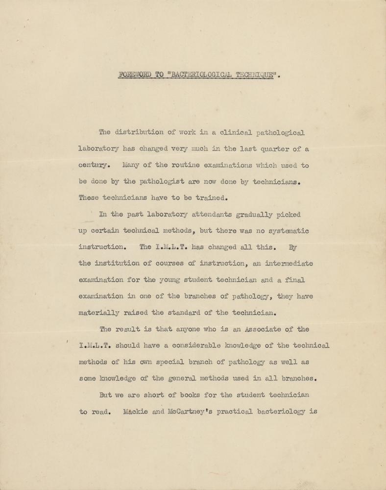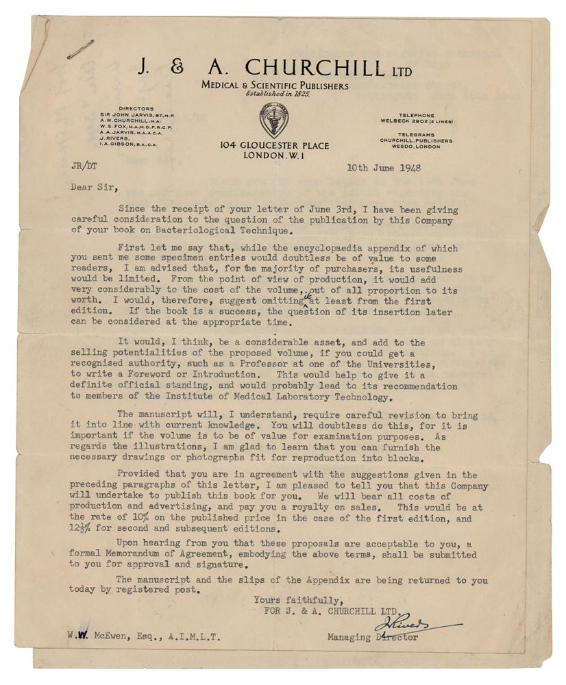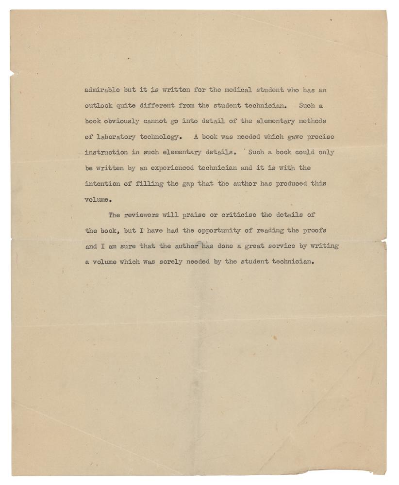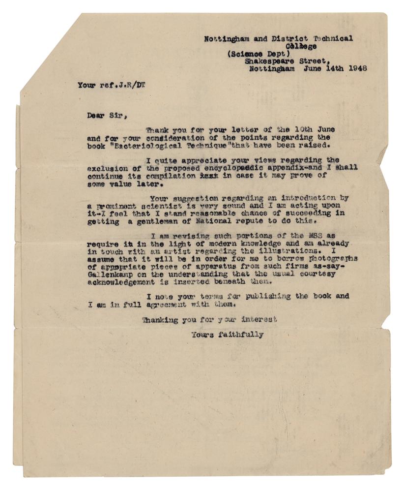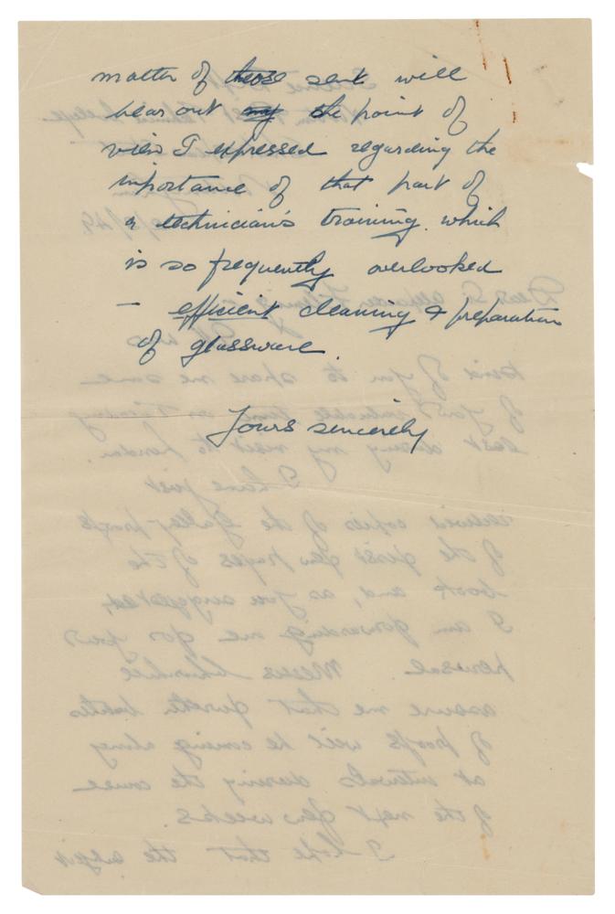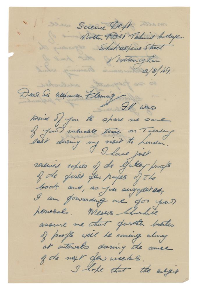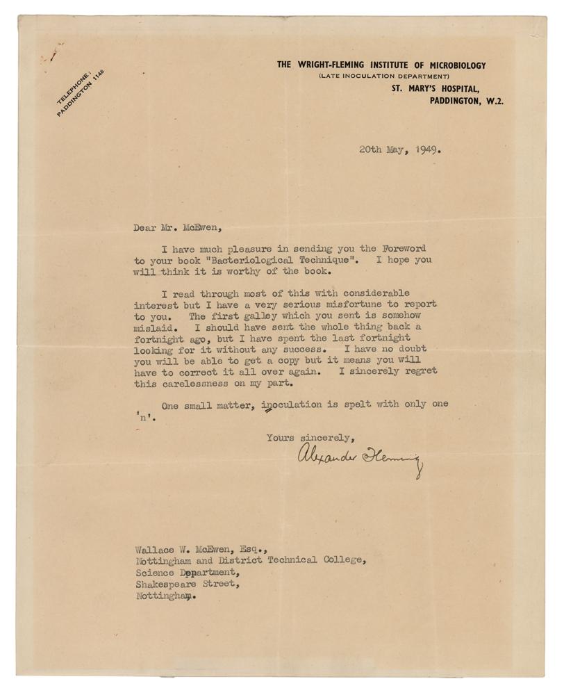 Scottish bacteriologist (1881-1955) who shared the 1945 Nobel Prize in Medicine for his role in the discovery and isolation of penicillin. TLS, one page, 8 x 10, Wright-Fleming Institute of Microbiology letterhead, May 20, 1949. Letter to Wallace W. McEwen of the Science Department of the Nottingham and District Technical College. In full: "I have much pleasure in sending you the Foreword to your book 'Bacteriological Technique.' I hope you will think it is worthy of the book. I read through most of this with considerable interest but I have a very serious misfortune to report to you. The first galley which you sent is somehow mislaid. I should have sent the whole thing back a fortnight ago, but I have spent the last fortnight looking for it without any success. I have no doubt you will be able to get a copy but it means you will have to correct it all over again. I sincerely regret this carelessness on my part. One small matter, inoculation is spelt with only one 'n.'" In fine condition, with toning from prior display. Accompanied by a typed copy of the foreword, a letter written to Fleming from the Science Department, and some related correspondence.