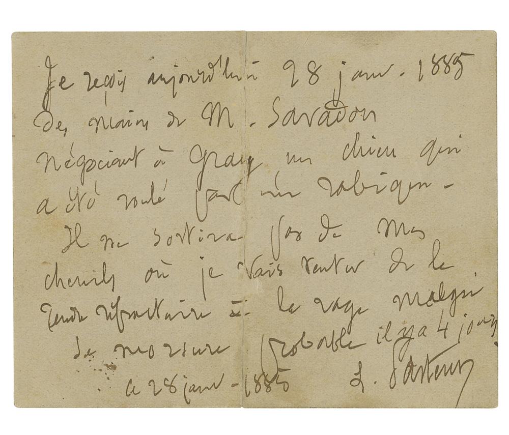 ALS in French, signed “L. Pasteur,” one page, 4.5 x 3.5, January 28, 1885. Important letter about his research on a rabies vaccine, in part (translated): "I have received today, from the hands of Mr. Savadon, a dealer in Gray, a dog that has been attacked by a rabid dog. It will not leave my kennel where I will try to make him resistant to rabies despite the bite being probably at least four days old." In very good to fine condition, with a fragile central vertical fold, reinforced with tape on the reverse.