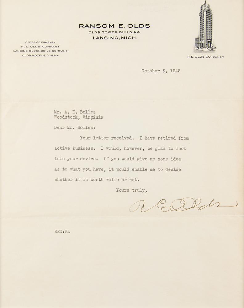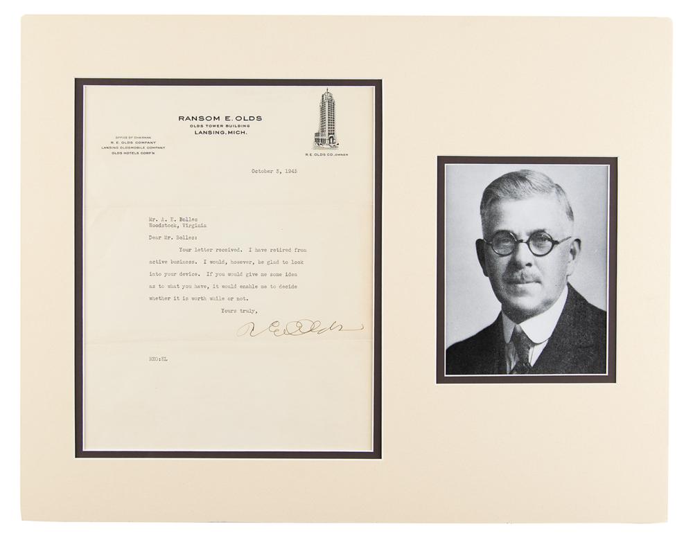 Inventor and automotive magnate (1864-1950) who founded the Oldsmobile and REO Motor Car Companies. TLS signed “R. E. Olds,” one page, 8 x 10, personal letterhead, October 3, 1945. Letter to A. E. Bolles, in part: "I have retired from active business. I would, however, be glad to look into your device. If you would give me some idea as to what you have, it would enable me to decide whether it is worth while or not." Double-matted with a portrait to an overall size of 18 x 14. In fine condition.
