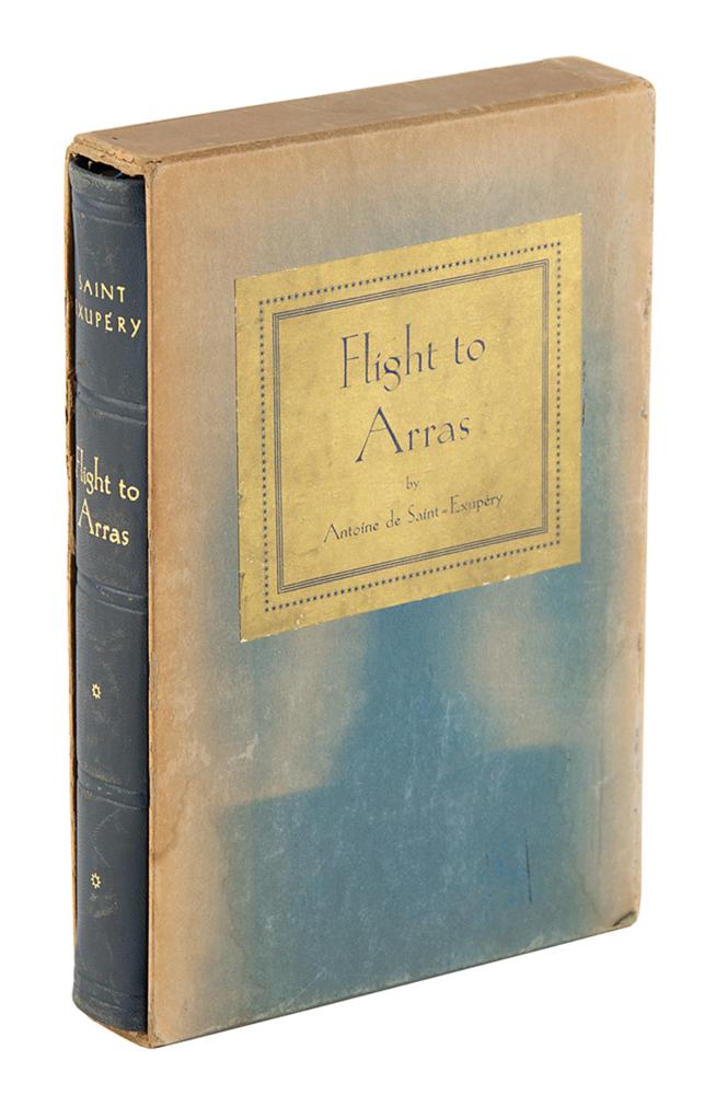 Signed book: Flight to Arras. First edition. NY: Reynal & Hitchcock, 1942. Hardcover with slipcase, 6 x 8.5, 255 pages. Signed on the colophon in fountain pen by the author, Antoine de Saint-Exupery, and illustrator, Bernard Lamotte. Autographic condition: fine. Book condition: VG+/None in a G slipcase, with light scuffing to spine and sunning, dampstaining, and edge splits to the case. Written in 1942, Flight to Arras recounts Saint-Exupery's role in the Armée de l'Air (French Air Force) as pilot of a reconnaissance plane during the Battle of France in 1940.
