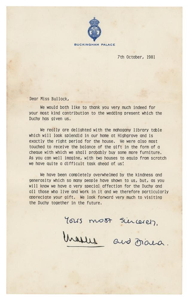 TLS signed “Charles" and "Yours most sincerely, and Diana,” one page, 8 x 13, Buckingham Palace letterhead, October 7, 1981. Letter to Miss S. F. Bullock, in full: "We would both like to thank you very much indeed for your most kind contribution to the wedding present which the Duchy has given us. We really are delighted with the mahogany library table which will look splendid in our home at Highgrove and is exactly the right period for the house. We were also most touched to receive the balance of the gift in the form of a cheque with which we shall probably buy some more furniture. As you can well imagine, with two houses to equip from scratch we have quite a difficult task ahead of us! We have been completely overwhelmed by the kindness and generosity which so many people have shown to us, but as you will know we have a very special affection for the Duchy and all those who live and work in it and we therefore particularly appreciate your gift. We look forward very much to visiting the Duchy together in the future." In very good to fine condition, with scattered light foxing. Accompanied by the original mailing envelope, a 1980 Duchy of Cornwall Manor of Kennington tenancy agreement, and a 1987-88 Duchy of Cornwall residents association membership card. The fabled royal wedding took place at St. Paul’s Cathedral on July 29, 1981, before an invited congregation of 3,500 and an estimated worldwide television audience of 750 million.