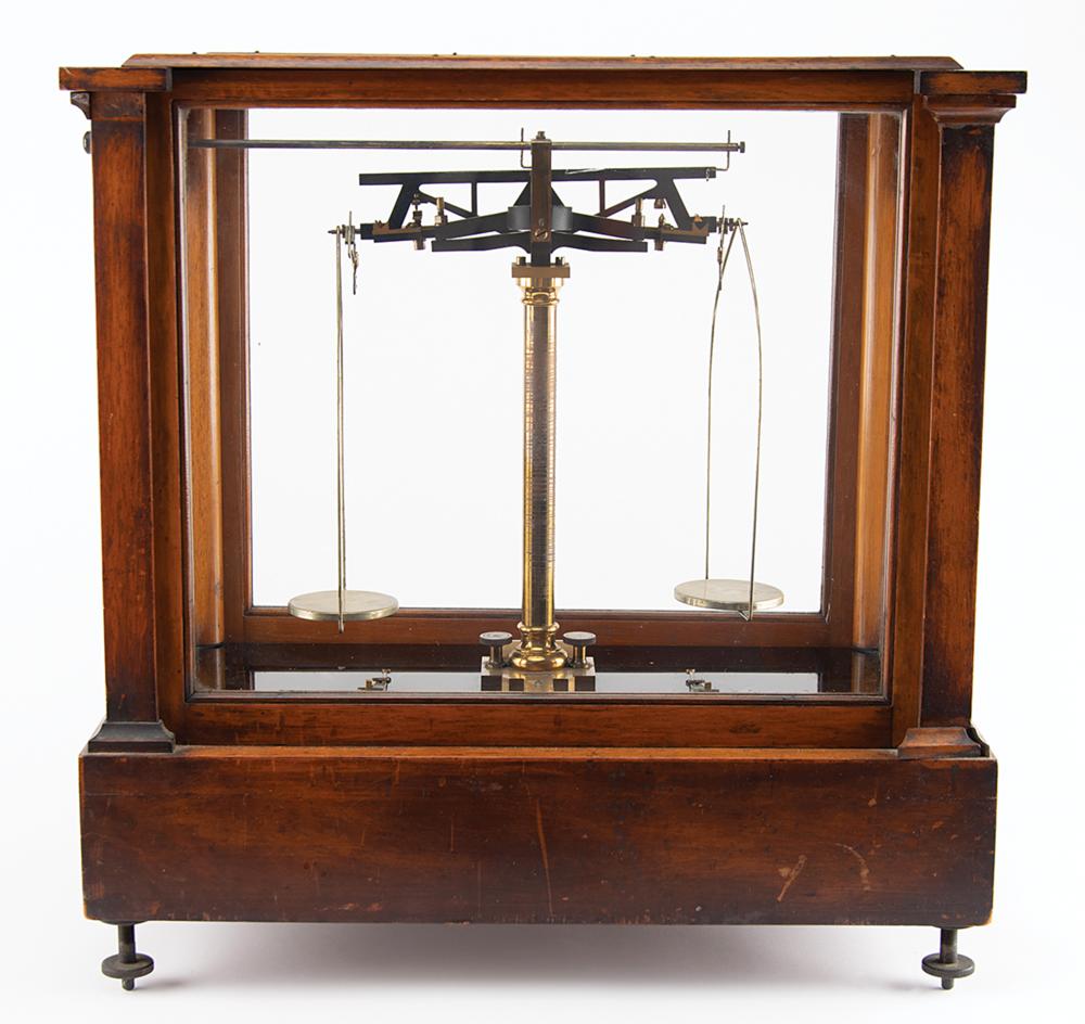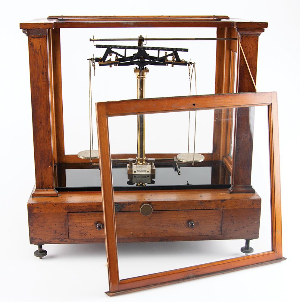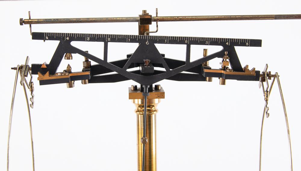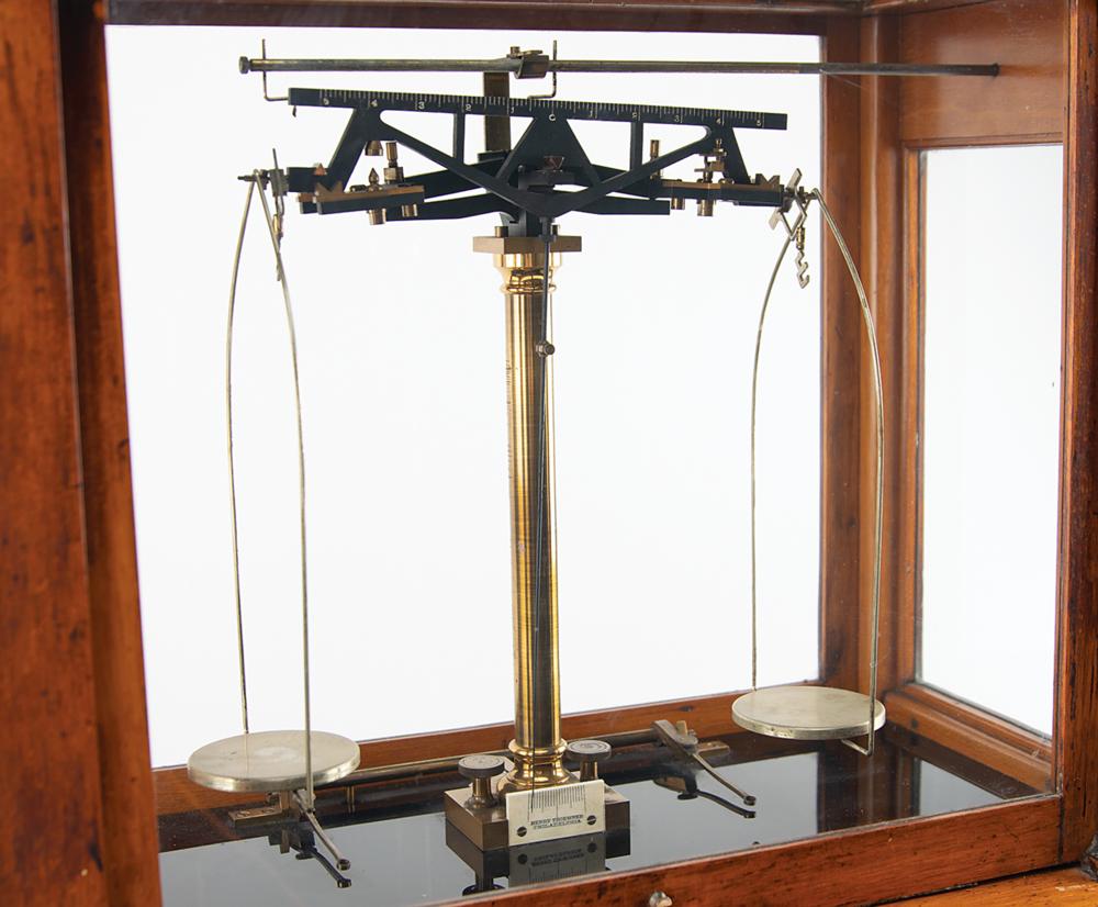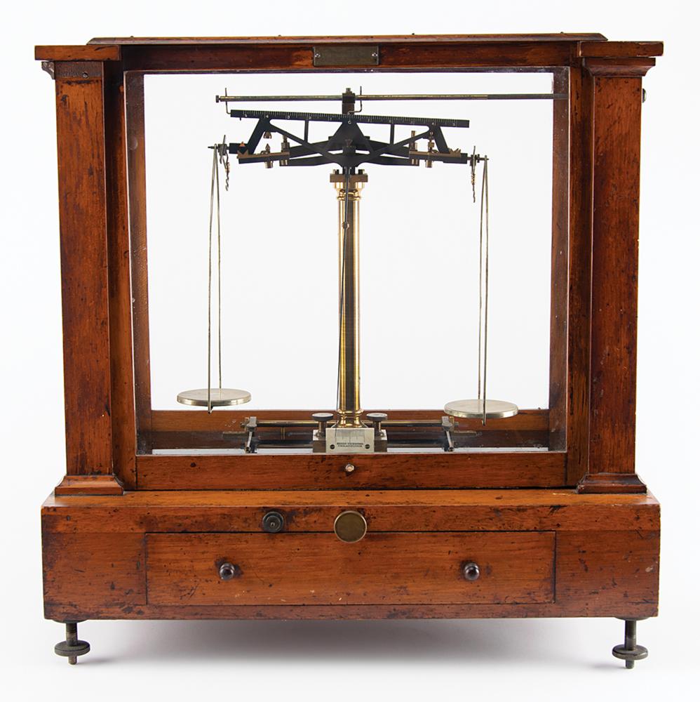 Brass Apothecary/Gold Scale, Henry Troemner, Philadelphia. Cherry and brass, in glass case, circa 1890-1910. Measures approximately 17.5" wide x 19” tall x 9.25” deep. Two complete sets of weights in original boxes marked “Henry Troemner Phila.” Miscellaneous measuring items included. External metal plate with inscription: “Henry Troemner Maker PHILADELPHIA, PA.” Internal ivory measuring plate with inscription “Henry Troemner Philadelphia.” One knob missing, otherwise very good condition.