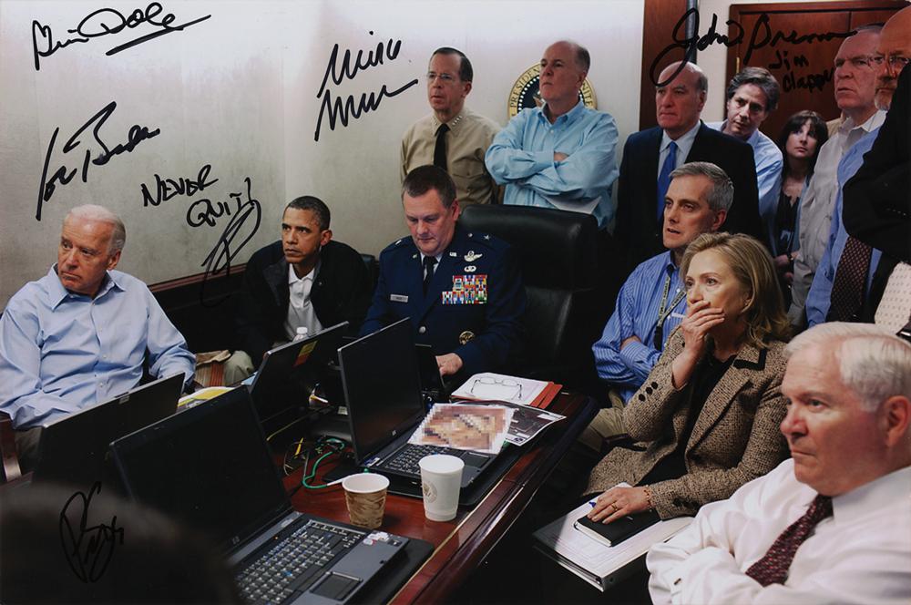 Color satin-finish 12 x 8 photo of President Barack Obama and members of the national security team as they receive an update on the mission against Osama bin Laden in the Situation Room of the White House on May 1, 2011, signed in black felt tip by Joe Biden, John Brennan, Mike Mullen, James Clapper, Bill Daley, Rob O'Neill (the Seal Team Six member credited with killing bin Laden), and photographer Pete Souza. In fine condition.