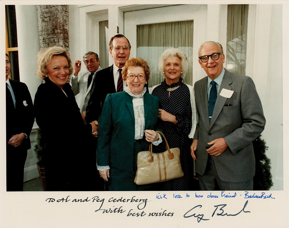 Color vintage satin-finish 10 x 8 photo of the Bushes meeting with Minnesota Congressman Al Cederberg and his wife, calligraphically inscribed in the lower border, "To Al and Peg Cederberg, with best wishes," and signed in black felt tip, "George Bush," and blue felt tip, "With love to two dear friends, Barbara Bush." Reverse bears an "Official Photograph / The White House" stamp. In very fine condition.