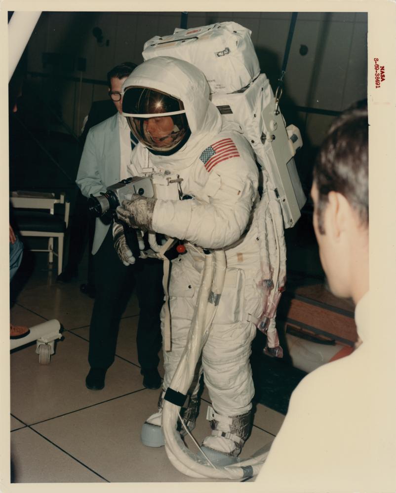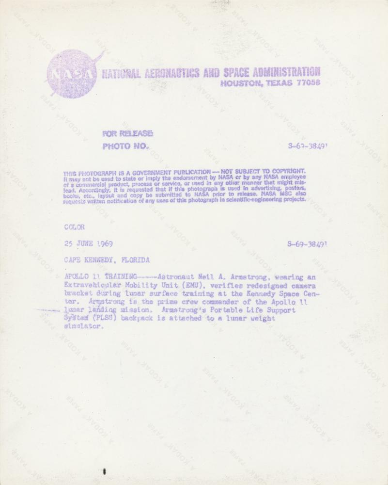 Official color glossy 8 x 10 red-numbered NASA photo (S-69-38491) of Neil Armstrong during pre-flight fit and function check of the Extravehicular Mobility Unit (EMU). Reverse bears purple NASA caption text and “A Kodak Paper” watermarks. In fine condition.