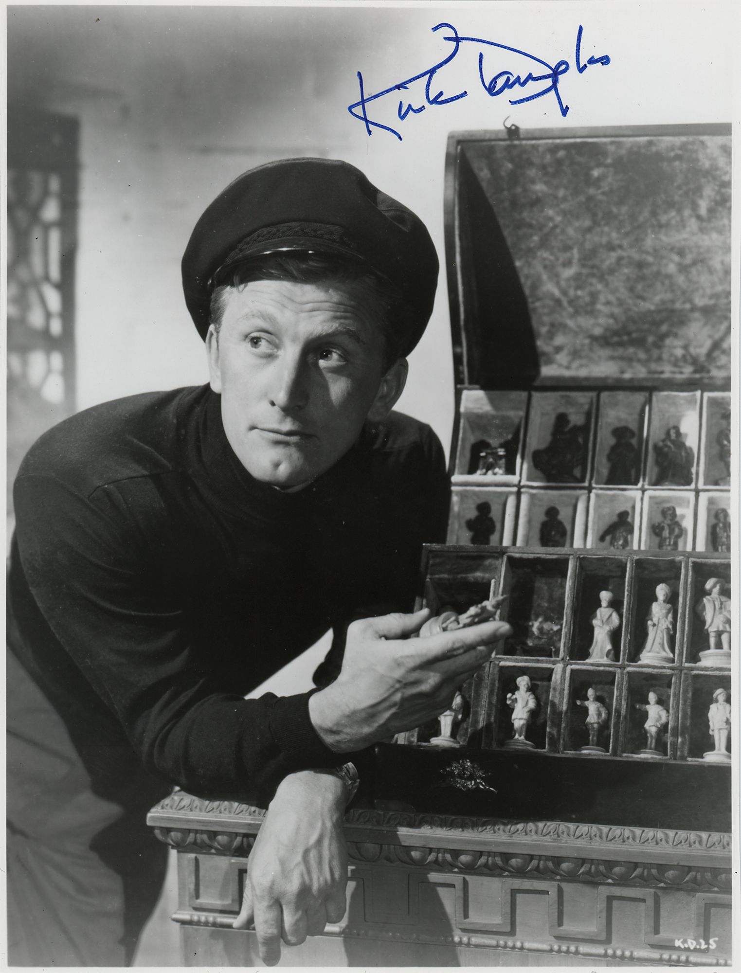 Glossy 7 x 9.25 photo of Kirk Douglas in one of his classic roles, signed in blue felt tip. In fine condition, with evenly trimmed edges.