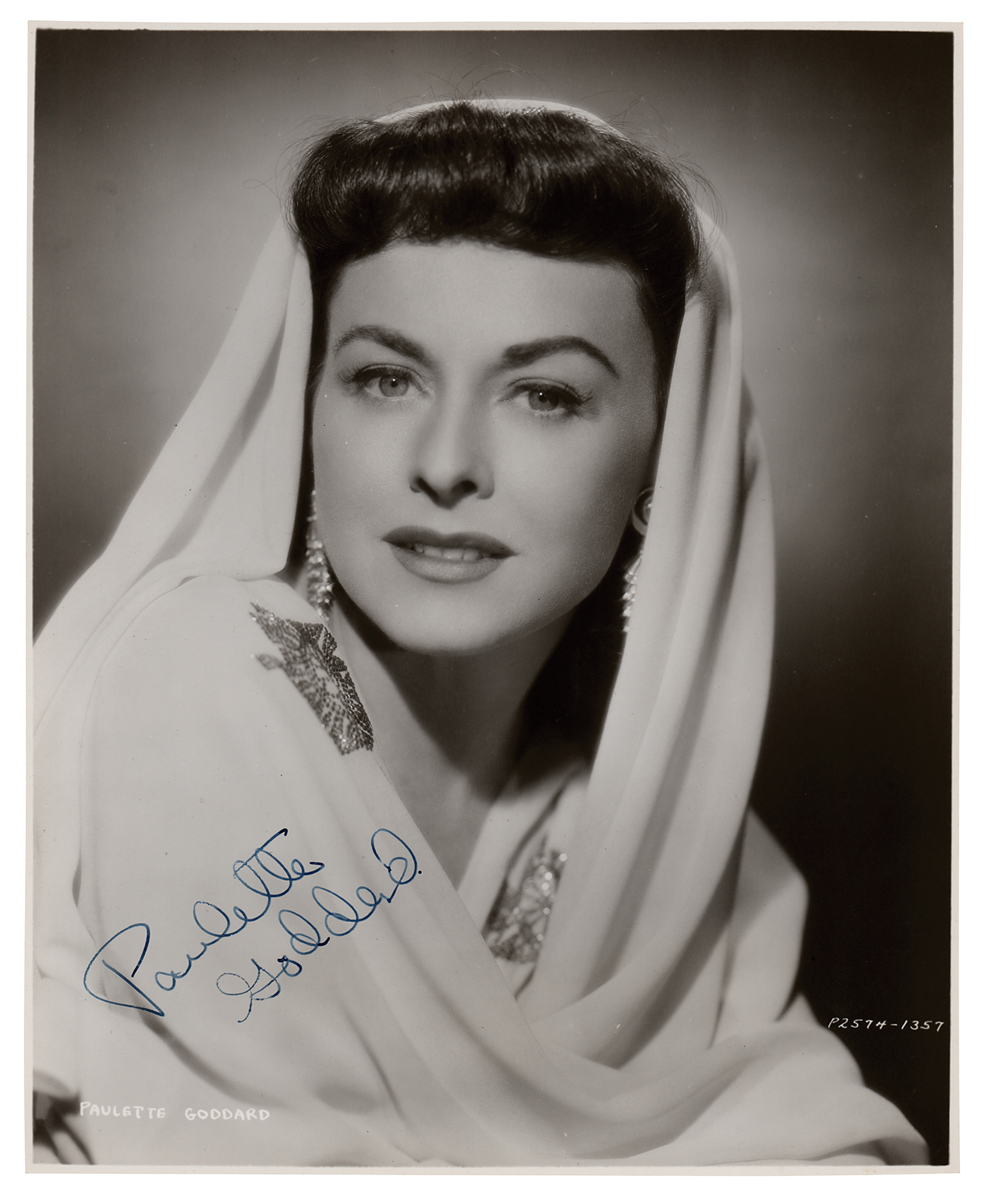 Vintage glossy 7.5 x 9.25 head-and-shoulders portrait of Paulette Goddard draped in white fabric, neatly signed in fountain pen. In fine condition, with evenly trimmed edges.