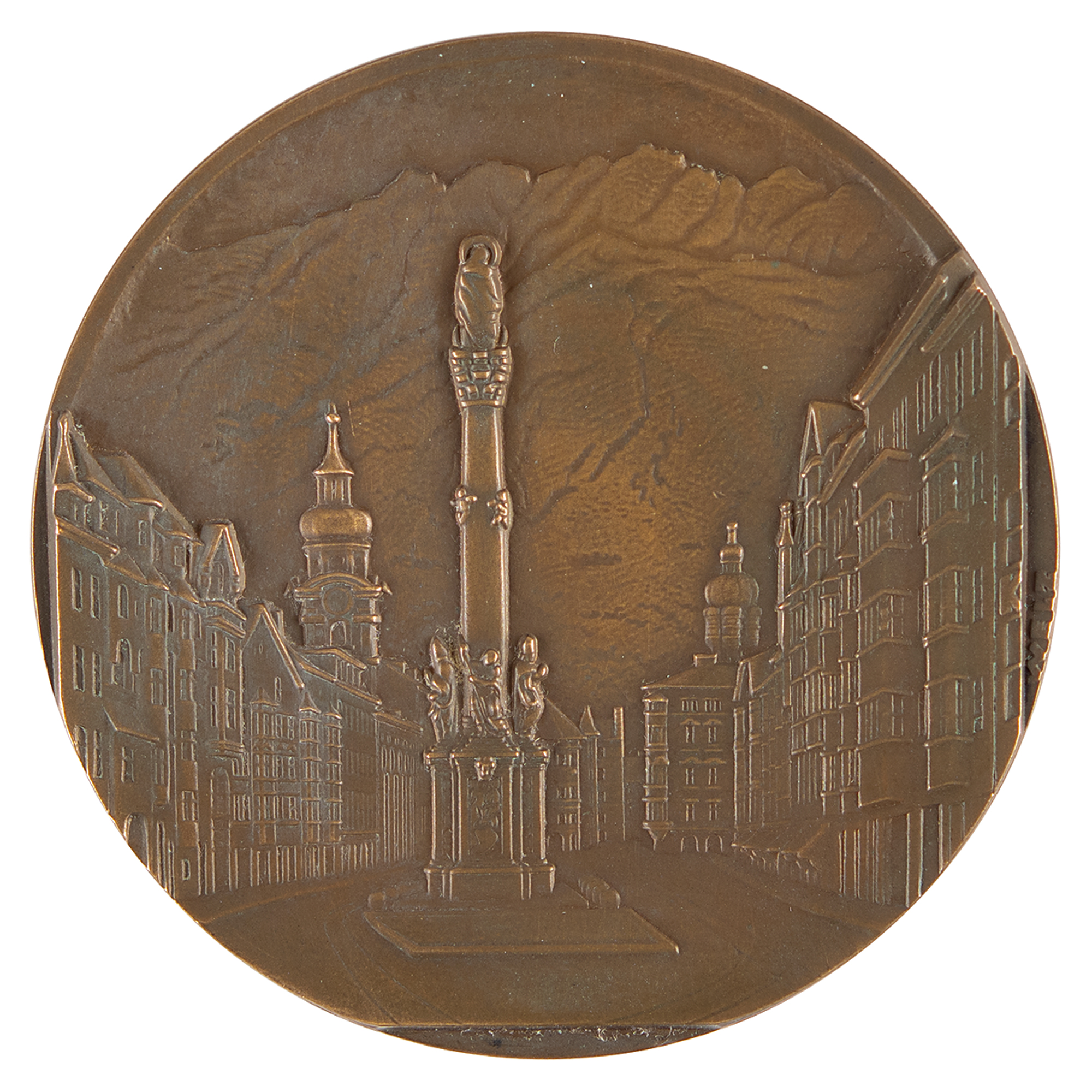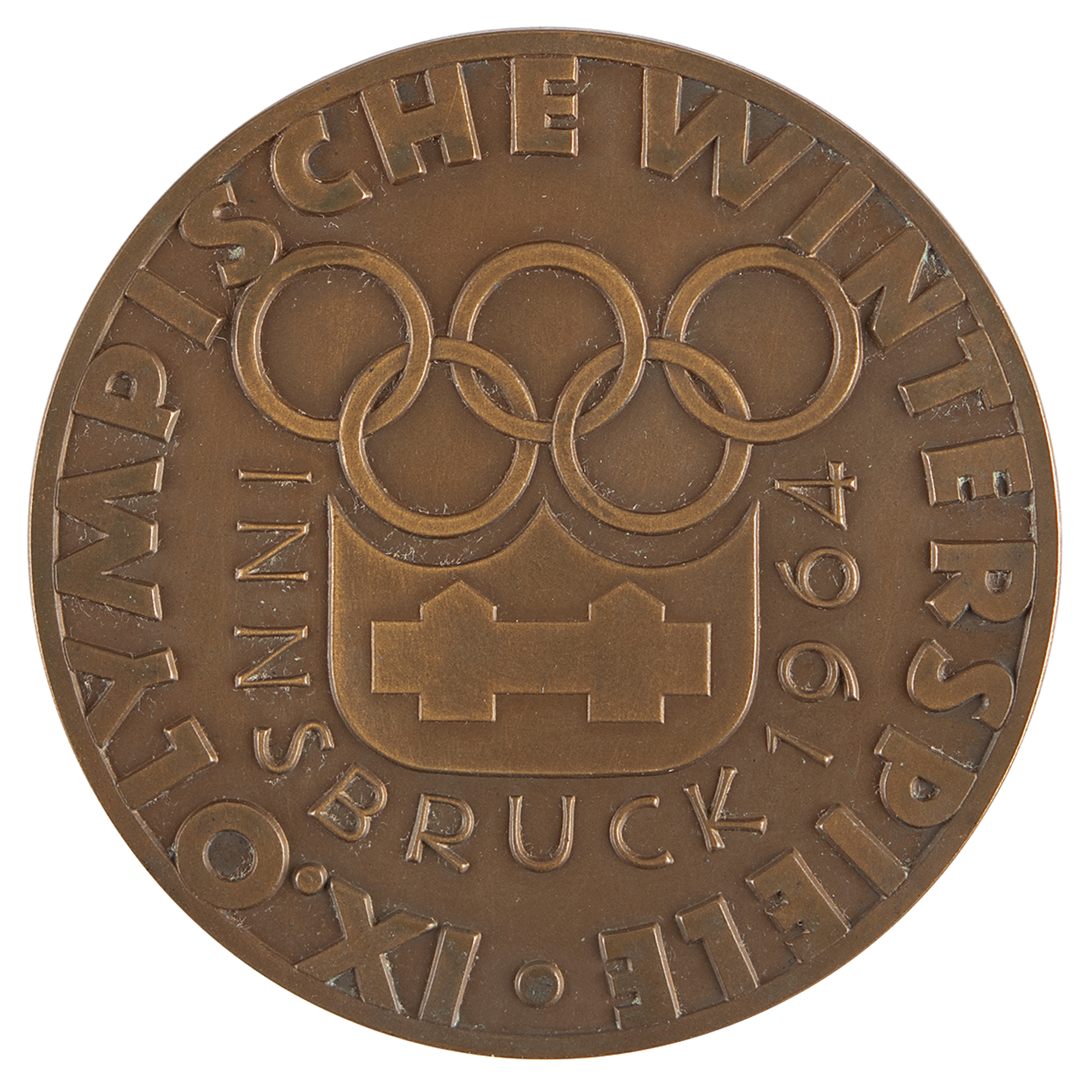Participation medal issued for the Innsbruck 1964 Winter Olympics. Bronze, 61 mm, 78 gm, by Welz. The front depicts the Innsbruck Games emblem with raised German text; the reverse bears a wonderful city view of Innsbruck with the Austrian Alps in the background. Complete with its red plastic wallet.
