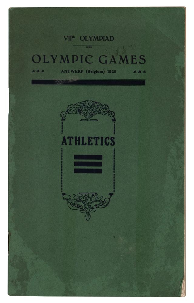 Scarce original English-language regulations booklet for athletics at the Antwerp 1920 Olympics, 31 pages, 5 x 8, distributed by the Executive Committee of the VIIth Olympiad. The booklet defines the special rules associated with a wide variety of athletics competitions, ranging from hurdles to tug-of-war. It also provides general Olympic regulations, lists the members of the various organizing committees, and offers a diagram of the stadium. In very good to fine condition, with scattered scuffing and staining to the cover, and a crease to the upper right corner.