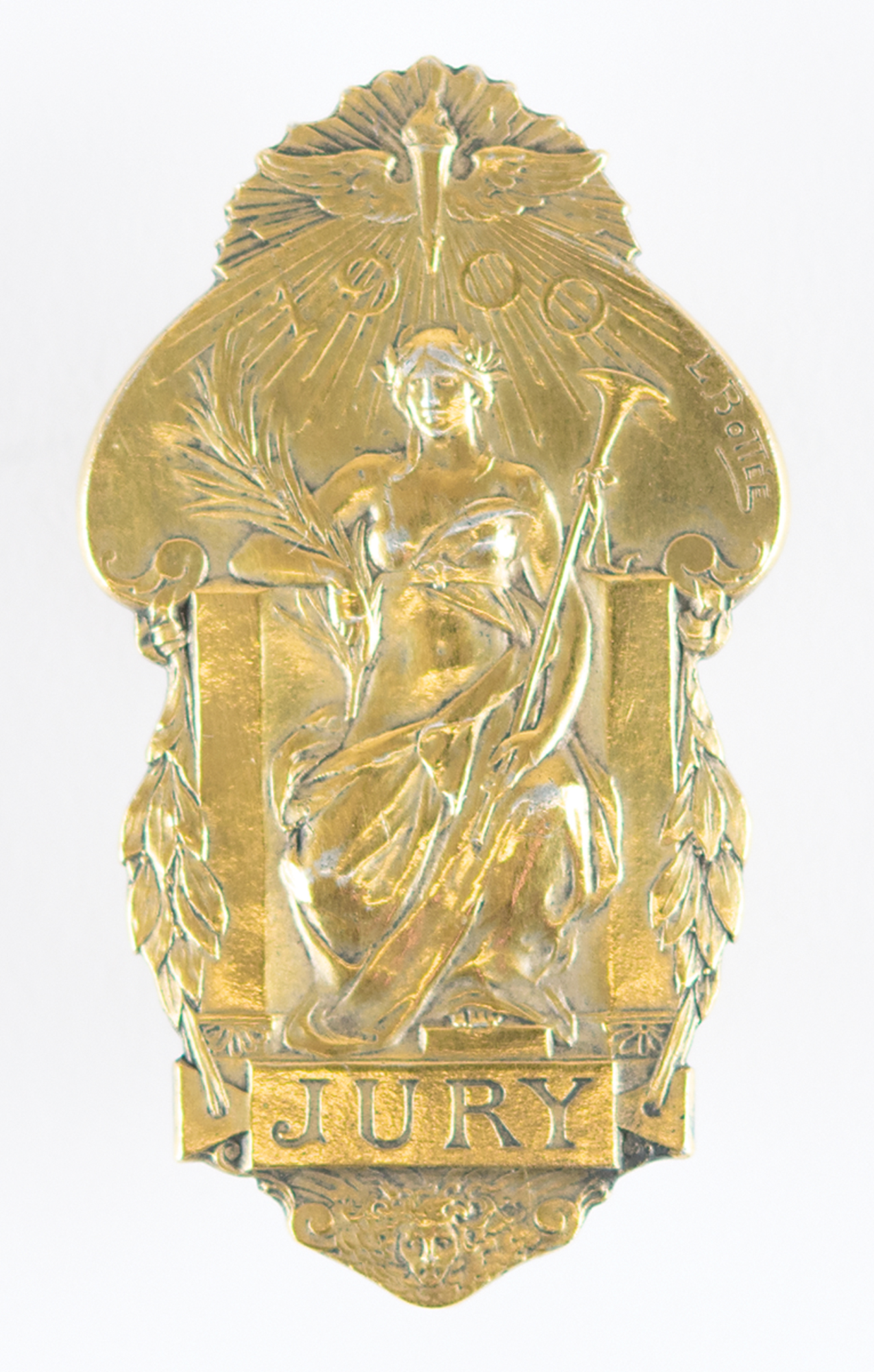 Scarce jury lapel badge from the Paris 1900 Exposition Universelle Internationale, which played host to that year's Olympics. Gilt silver, manufactured by Christofle of Paris, measuring 23 mm x 41 mm, with button closure on reverse. Front of the badge depicts Fame seated on a throne, a palm branch in her right hand and a trumpet in her left, “1900” to the top, “Jury” to the bottom, and the artist’s name along the right edge, "L. Bottee." These jury badges were used for all events at the Exposition (including the Olympic sports events), and are recognized as the first metal Olympic Games participation badges.
