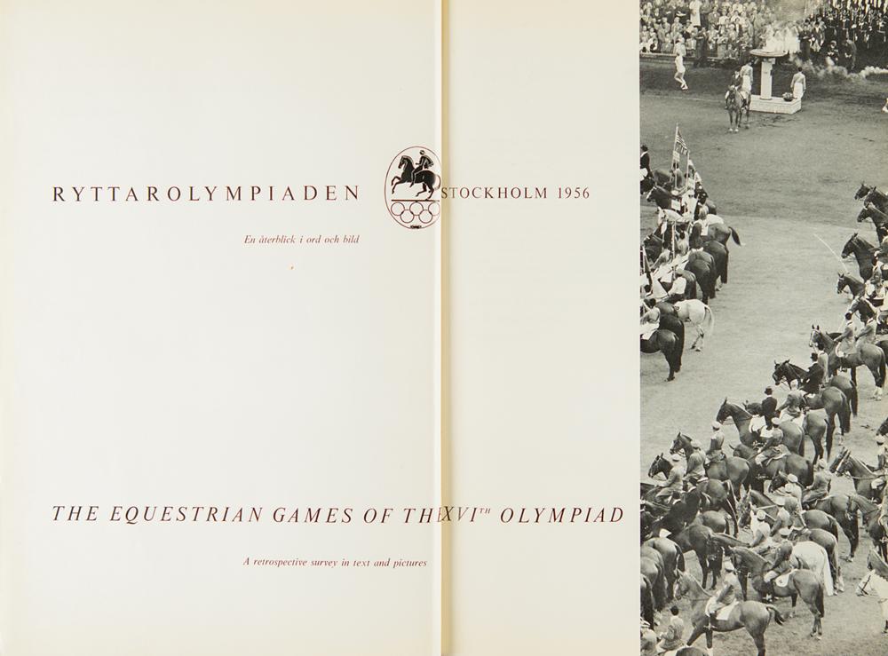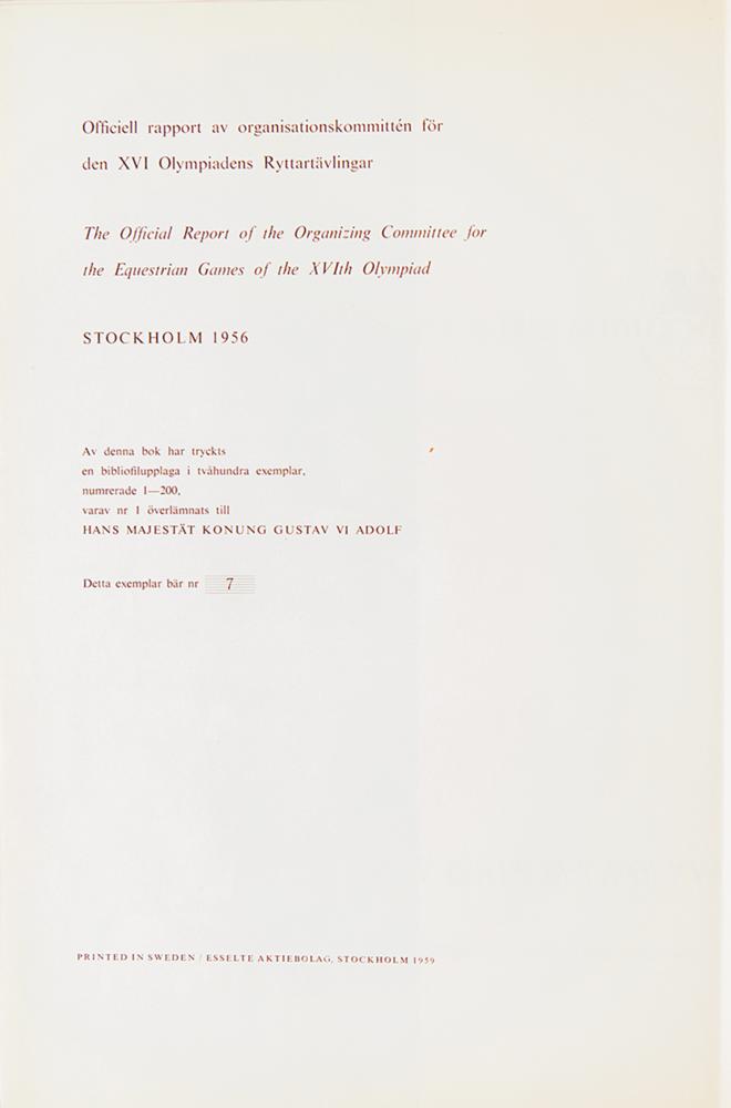 Handsome bilingual report in Swedish and English: The Equestrian Games of the XVIth Olympiad. Limited edition, numbered 7/200. Stockholm: Esselte Aktiebolag, 1959. Hardcover bound in full brown morocco with gilt-stamped titles and emblem, 8.5 x 12, 270 pages. Book condition: VG+/None, with light scuffing to the covers.