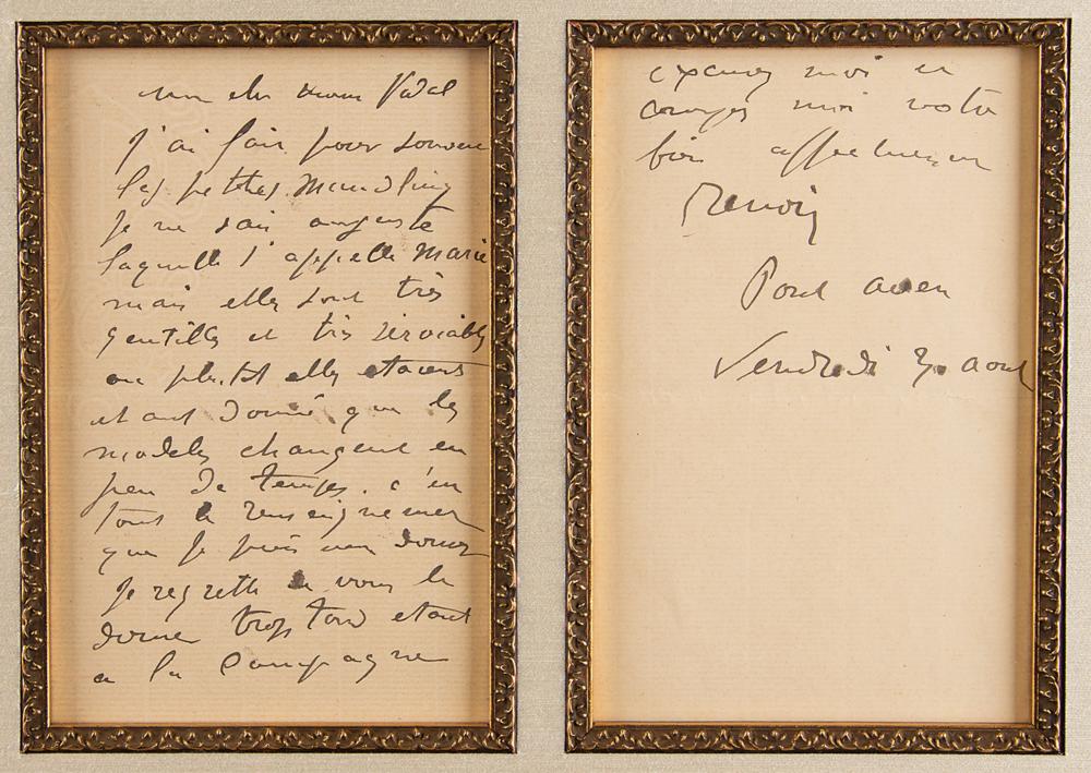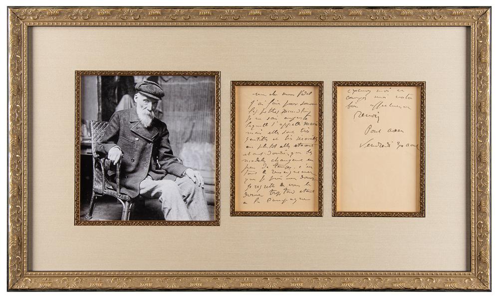 ALS in French, signed "Renoir," two pages, 4.25 x 6.5, August 30, [no year]. Untranslated handwritten letter by the celebrated Impressionist painter. Attractively matted and framed with a portrait to an overall size of 25 x 15. In fine condition.