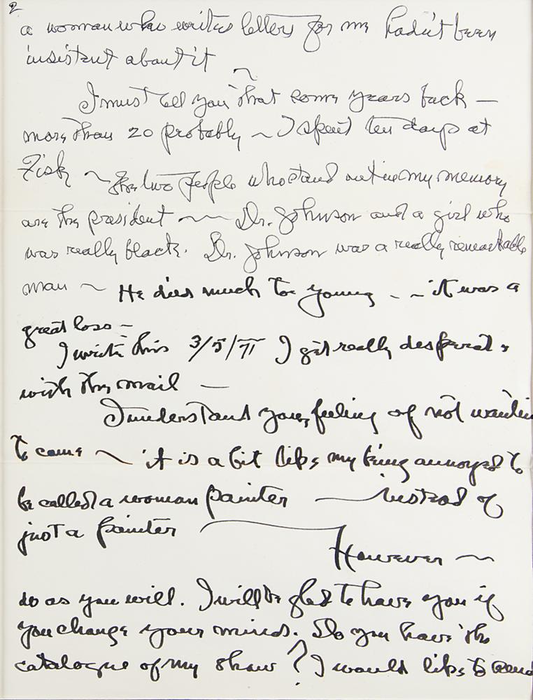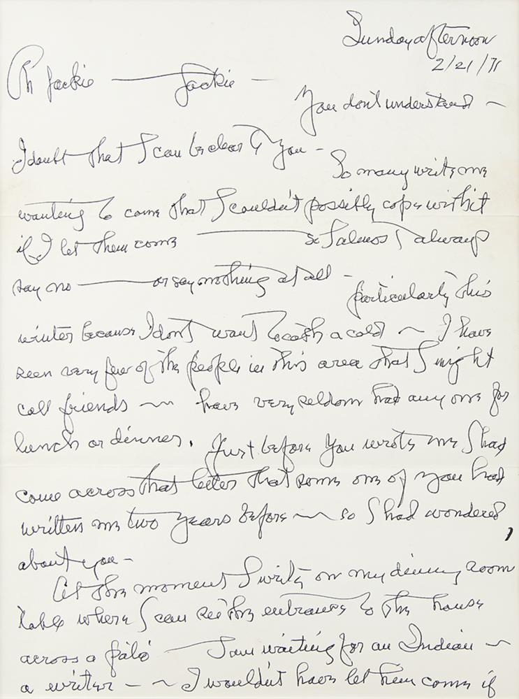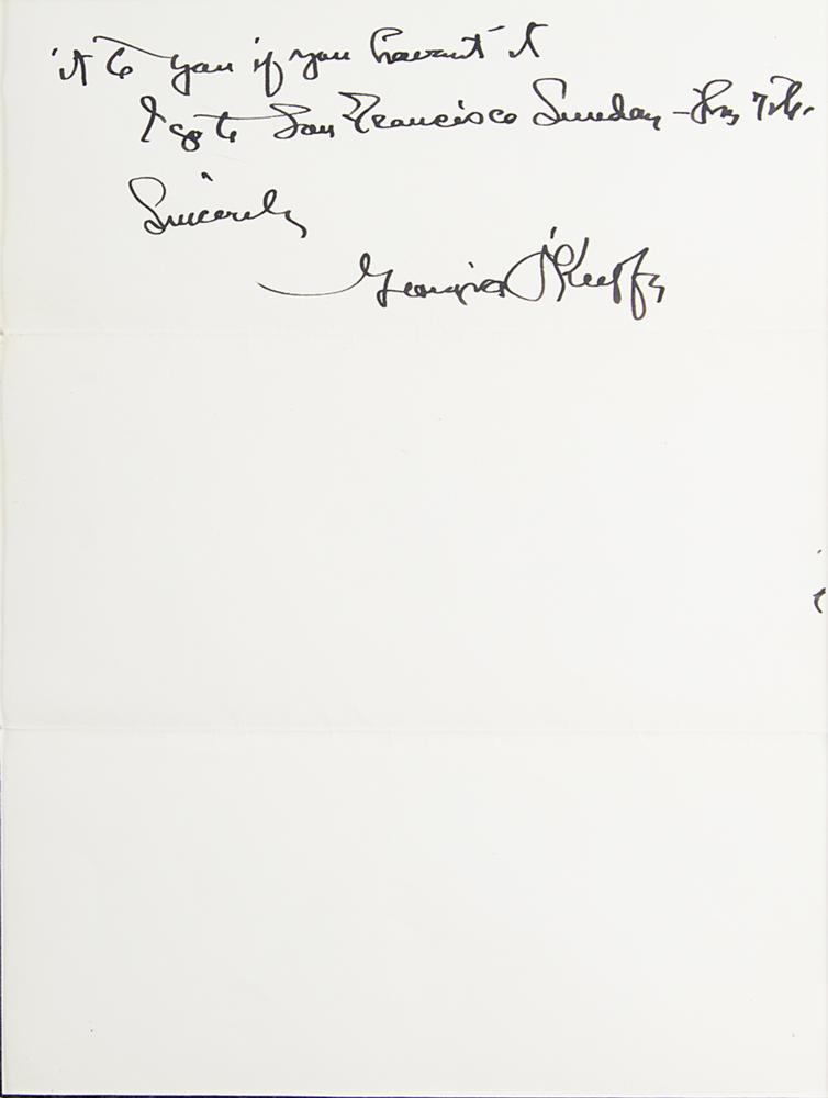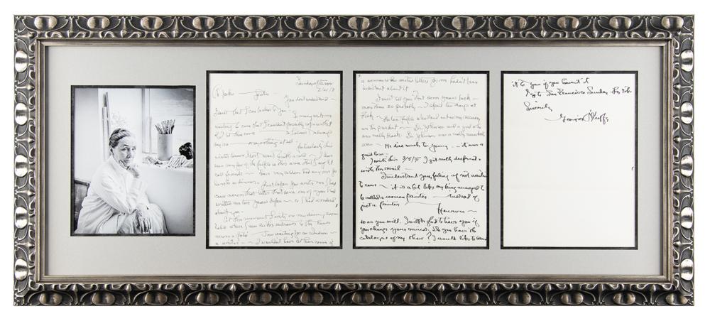ALS, three pages, 8.25 x 7.75, February 21, 1971. Handwritten letter to "Jackie," in part: "So many write wanting to come that I couldn't possibly cope with it if I let them come—so I almost always say no—or say nothing at all. Particularly this winter because I do not want to catch a cold—I have seen very few of the people in this area that I might call friends—have very seldom had anyone for lunch or dinner?I understand your feeling of not wanting to come—it is a bit like my being annoyed to be called a woman painter—instead of just a painter. However, do as you will. I will be glad to have you if you change your mind." Handsomely double-matted and framed with a portrait to an overall size of 43 x 18.5. In fine condition.