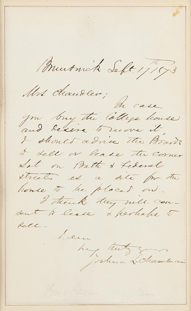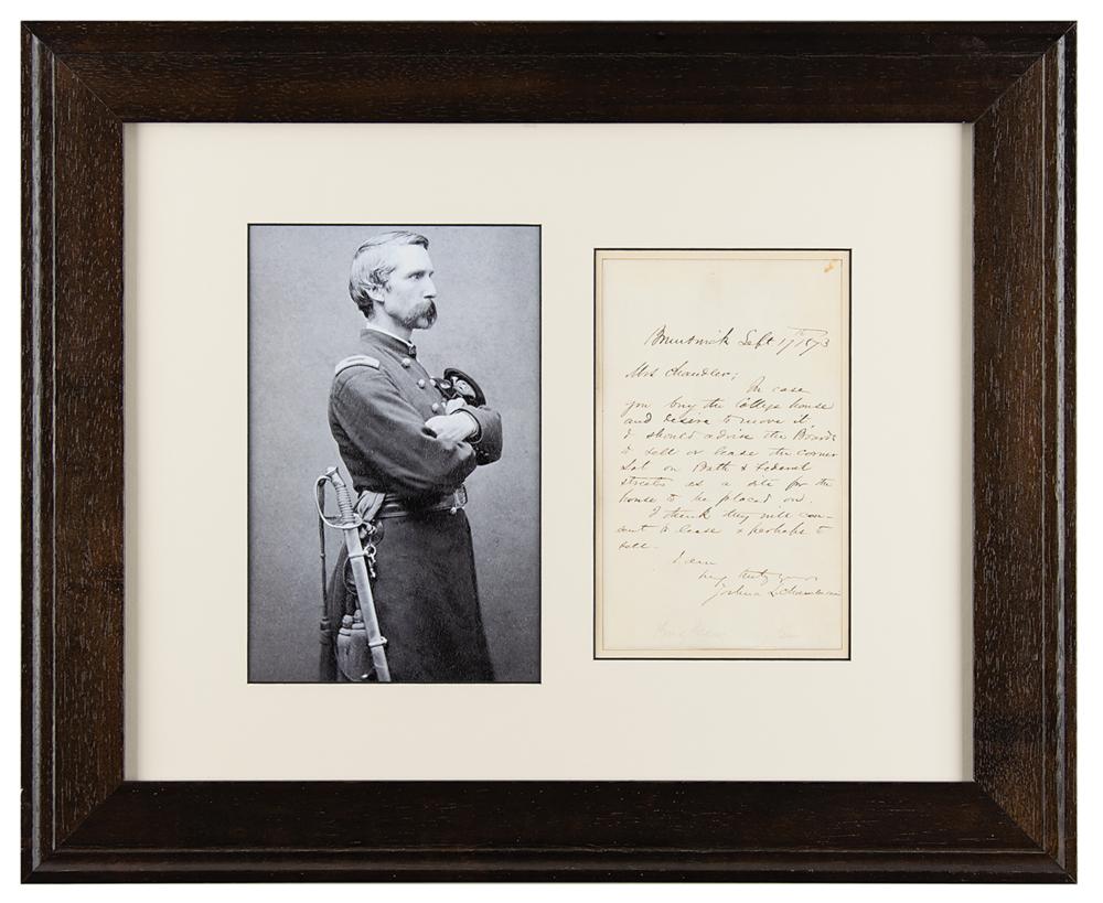 Maine-born Union major general (1828-1914) who was awarded the Congressional Medal of Honor for his defense of Little Round Top at Gettysburg. ALS signed “Joshua L. Chamberlain,” one page, 5 x 8, September 17, 1873. Handwritten letter to "Mrs. Chandler," in full: "In case you buy the college house and desire to move it, I should advise the boards to sell or lease the corner lot on Bath & Federal Streets as a site for the house to be placed on. I think they will consent to lease & perhaps to sell." Attractively mounted, matted, and framed with a portrait to an overall size of 22 x 18. In fine condition.