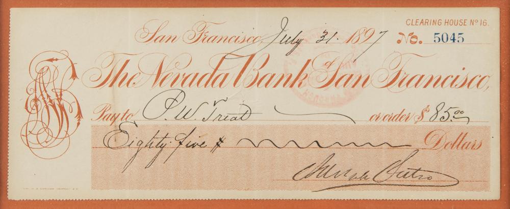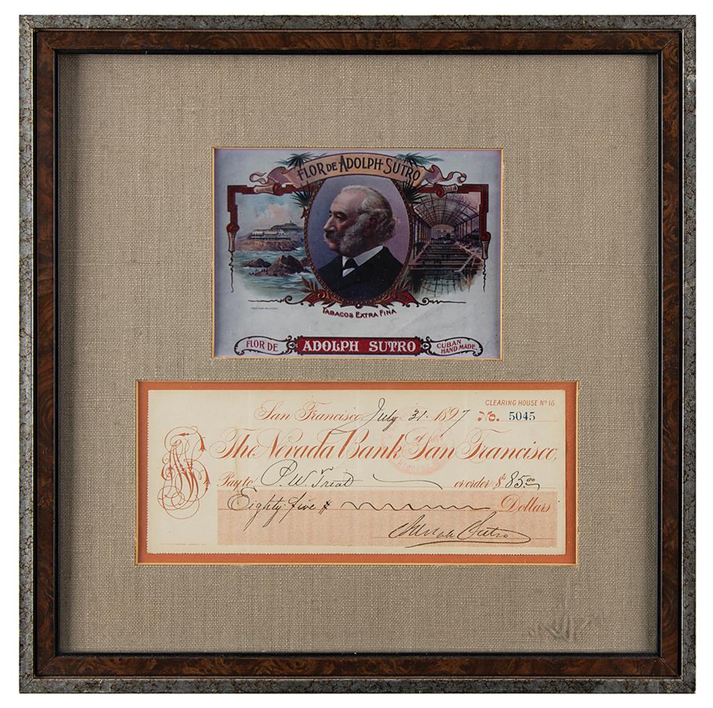 Mining engineer (1830-1898) who formed the Sutro Tunnel Company which constructed a tunnel to provide ventilation, drainage, and an easy means of transporting men and materials to and from the mines in the region of the Comstock Lode. Retiring to San Francisco in 1879, he became active in civic and business affairs, and was elected mayor in 1894. Nevada Bank of San Francisco check, 8.25 x 3.25, filled out in another hand and signed by Sutro, "Adolph Sutro," payable to P. W. Triat for $85, July 31, 1897. Mounted, matted, and framed with an image to an overall size of 13.75 x 13.75. In fine condition.