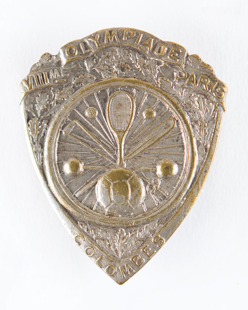 Handsome tennis badge from the Paris 1924 Summer Olympics, featuring a 25 mm x 32 mm badge with tennis pictogram and "VIIIme Olympiade Paris" in a banner across the top, and "Colombes" at the bottom. The reverse bears raised text: "Colombes-Sport, Francais, 1924." The tennis events at the 1924 Summer Games were held at the Stade Tennis de Colombes, slightly north of Paris. Tennis was discontinued as an Olympic sport after 1924 because of disputes over amateur rules between the International Olympic Committee (IOC) and the International Lawn Tennis Federation (ILTF). It would return as a demonstration sport in 1968 and 1984, before again becoming a full-medal sport in 1988.