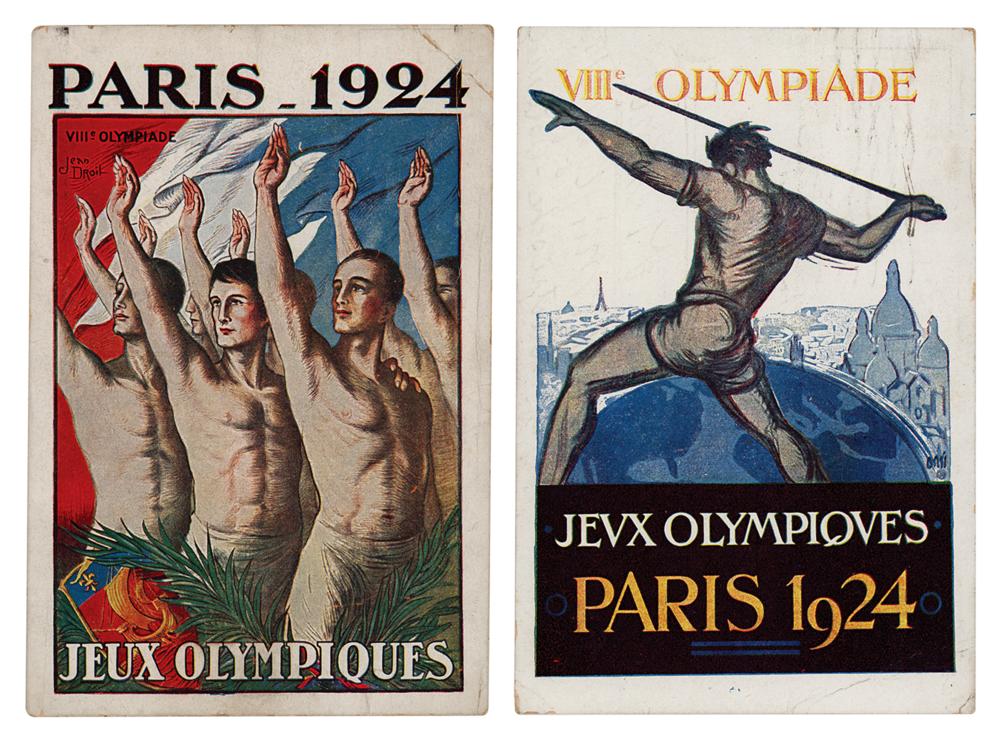 Two rare original vintage color postcards honoring the Paris 1924 Summer OLympics, 3.75 x 5.5, both featuring classic poster artwork from the Games of the VIII Olympiad. The reverse of one is annotated and postmarked to Gare Saint-Lazare on July 18, 1924. In overall fine condition, with light wear and creases.