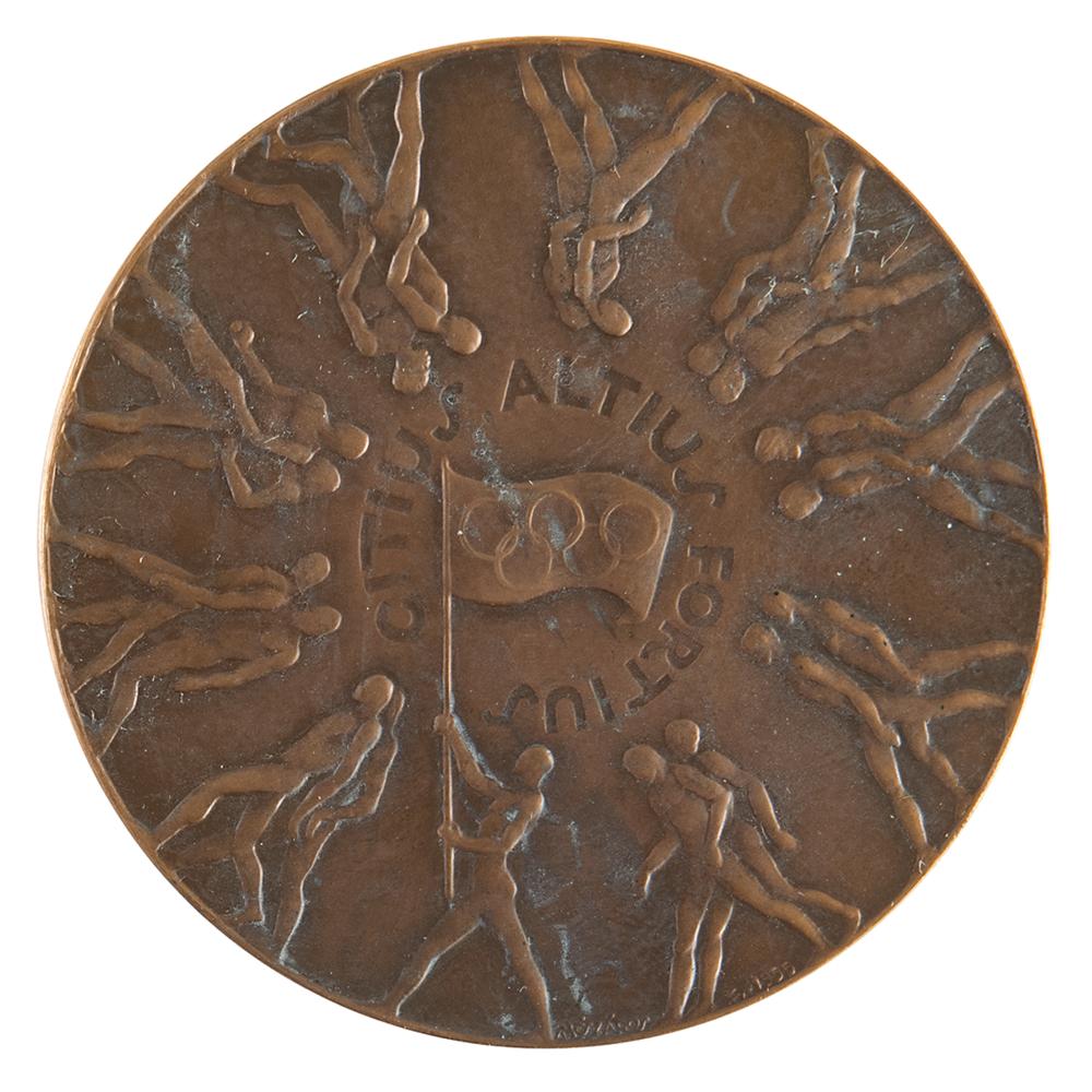Participation medal issued for the Melbourne 1956 Summer Olympics. Bronze, 63 mm, 105 gm, by Andor Meszaros. The front depicts the Olympic motto encircled by pairs of athletes following the march of a flag-bearer; the reverse bears the Melbourne coat of arms and Olympic rings, with raised text along the top, "Olympic Games Melbourne, 1956." Trivial discoloration to the front.