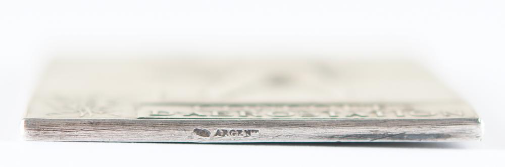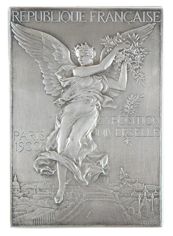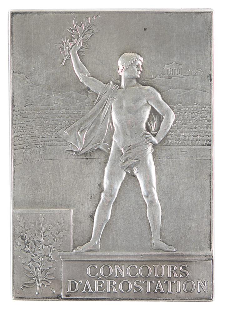 Winner's medal issued for the Paris 1900 Olympics. Silver, 40 mm x 58 mm, 57 gm, by Frederic Vernon, Paris. The front, inscribed "Republique Francaise, Exposition Universelle, Paris 1900," features a winged goddess scattering laurels over the grounds of the Exposition; the reverse identifies the sport as ballooning, "Concours D'Aerostation," and depicts a victorious athlete upon a podium with a stadium and the Acropolis in the background. Stamped "Argent" on an edge.