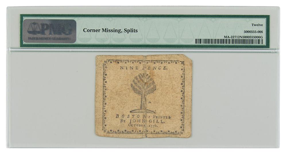 Encapsulated and graded by PMG Fine 12 NET (corner missing, splits). Issued on October 18, 1776, and known as 'Codfish' notes, the face plate for the twelve lowest denominations was engraved by Paul Revere and features a codfish in the border design. The backs of the twelve lowest denominations are printed from set type and a cast cut of a pine tree. Nathaniel Hurd began to engrave both the face plates and back cuts for the twelve highest denominations, but they were apparently completed by Revere. Revere apparently printed only the engraved faces and John Gill printed the backs of all bills. The twelve highest denominations contained dollar equivalents while the twelve lowest denominations did not.