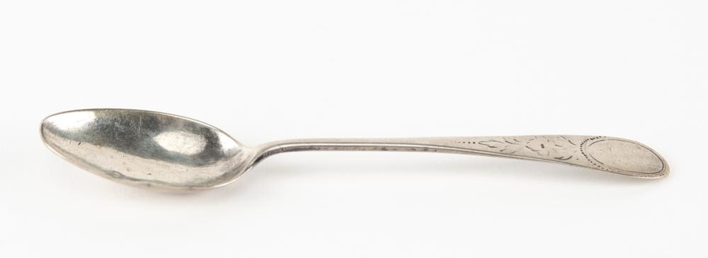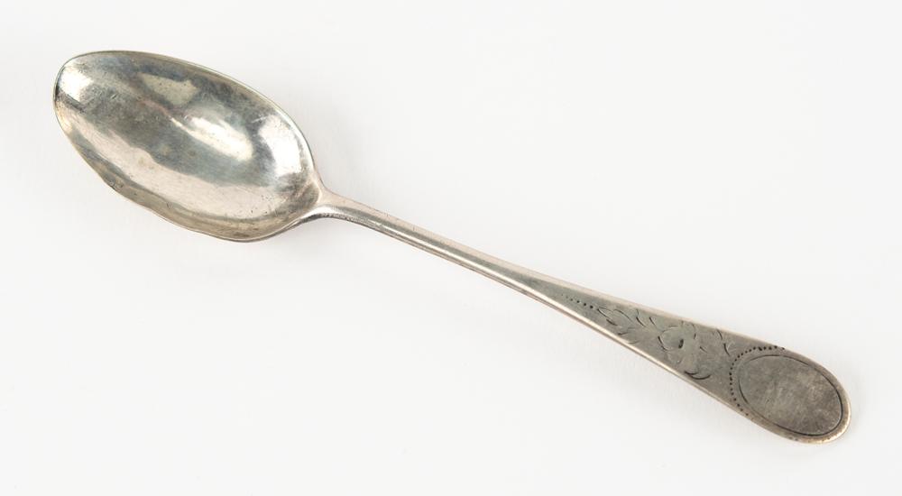 Beautiful teaspoon made by famous silversmith and patriot Paul Revere, with a 1.75″ long oval bowl and total length of 5.5″, stamped on the underside in italics with his maker's mark, "PR." The handle is handsomely engraved with an oval and floral scrollwork. In very good to fine condition, with some dings and dents to the spoon's bowl.