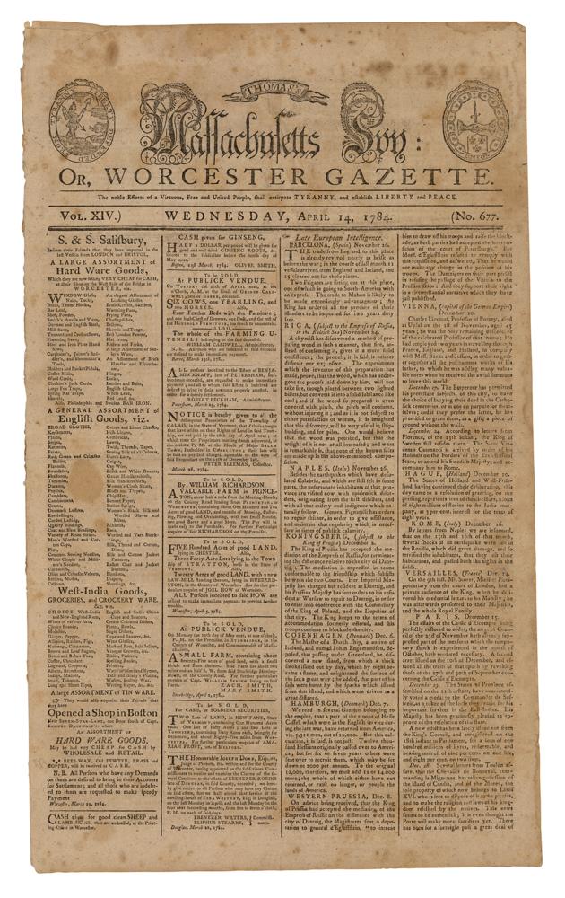 Complete issue of the Massachusetts Spy or, Worcester Gazette from April 14, 1784, four pages, 11 x 18.5, printed in Worcester by Isaiah Thomas, with the masthead woodcut done by Paul Revere. The ornately illustrated masthead features the newspaper's title flanked by two-medallion shaped illustrations. At the top, "Thomas’s," appears in a ribbon scroll and beneath that is a star and Massachusetts Spy with flourishes and fern-shaped scrolls. The medallion to the left features an allegory of a Native American with a liberty cap and pole standing on one piece of land and pointing a spear towards a lion, presumably Britain, on a separate piece of land. Surrounding the image is the text “Liberty Defended From Tyranny.” To the left in an additional medallion which features two clasping hands in the center; above them is a dagger pointed upwards. Beneath them are three fleur-de-les in a shield and below that the text “Union.” Surrounding the image are thirteen linked rings, each with a star in the center.