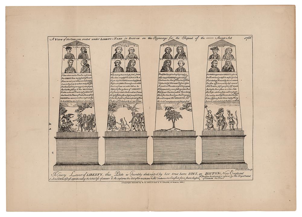 Historic 1881 facsimile reproduction of Paul Revere's 1766 engraving entitled "View of the Obelisk Erected under Liberty-Tree in Boston on the Rejoicings for the Repeal of the Stamp Act," featuring an image area of 13.25 x 9.25 on an off-white 18.75 x 13.25 sheet. In 1766, Paul Revere designed an obelisk to be erected under the 'Liberty Tree' in Boston to celebrate the repeal of the Stamp Act, the principal incitement to rebellion in the American Colonies. Revere engraved a copper-plate for printing with the text and images of the obelisk, which were mainly common motifs of the culture of the American colonies. The figure of 'Liberty' appears twice in the image: in the left panel as a 'Winged Woman' holding her Staff with the Liberty Cap on top, and also in the right panel as a 'Maiden' in contemporary dress with her Staff and Liberty Cap, accompanied by Britannia, and also by America represented in several panels as a classic Indian Maiden. In fine condition, with intersecting folds.
