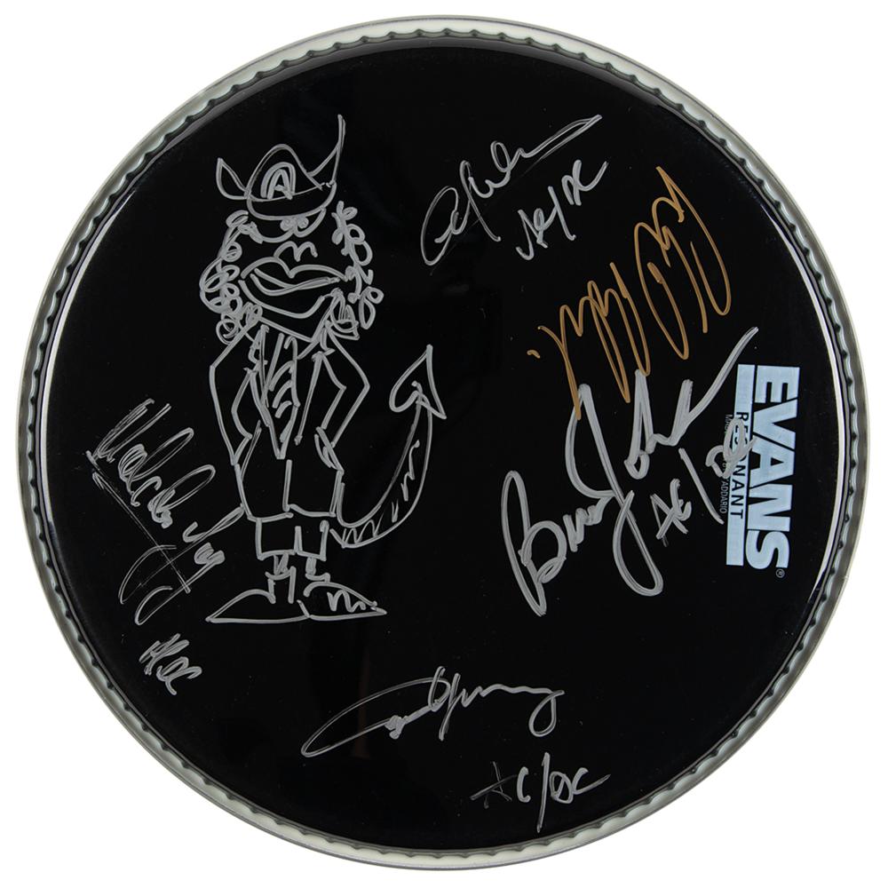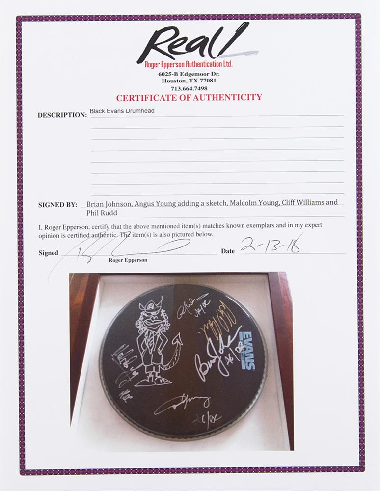 Black coated 10.5″ Evans Resonant drumhead, signed in silver and gold ink by Malcolm Young, Angus Young (adding a large, fantastic 'devil schoolboy' self-portrait sketch), Brian Johnson, Cliff Williams, and Phil Rudd. In fine condition. Accompanied by a full letter of authenticity from REAL.