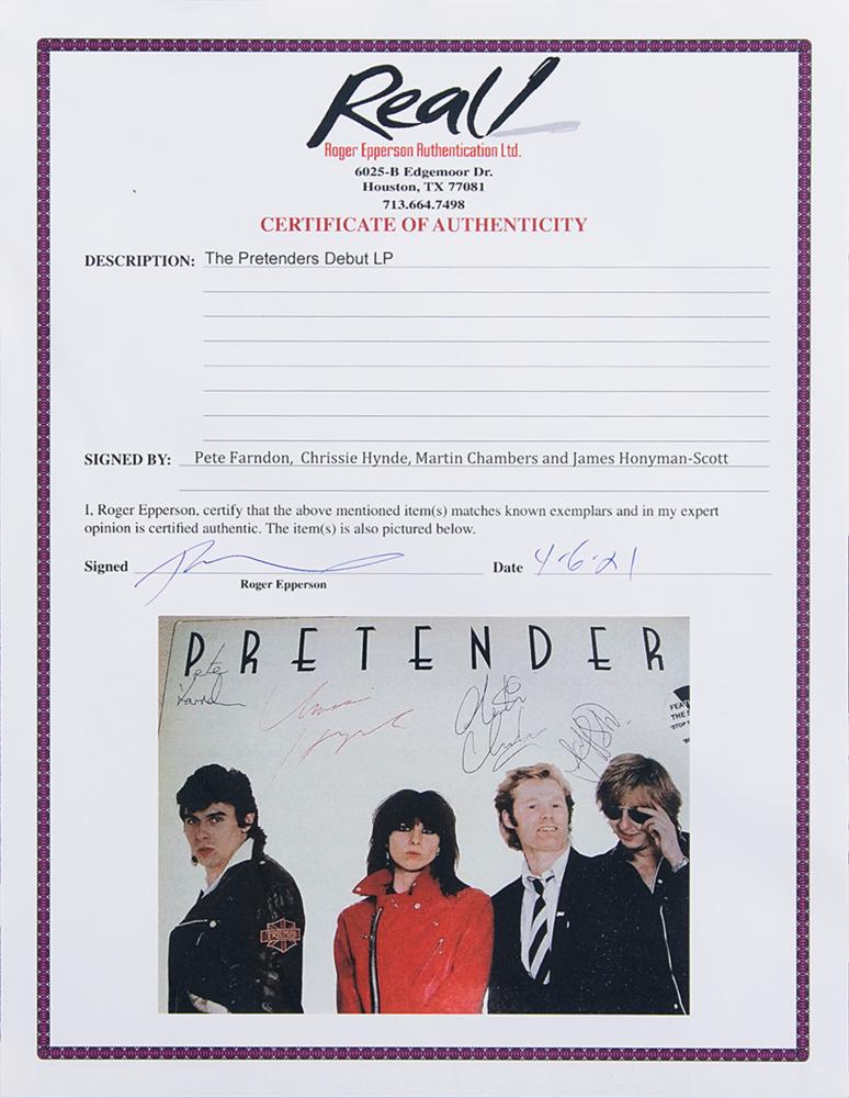 Self-titled debut album by The Pretenders, signed on the front cover in red ballpoint by Chrissie Hynde, and in black ballpoint by James Honeyman-Scott, Martin Chambers, and Pete Farndon. In fine condition. The record is included. Accompanied by a full letter of authenticity from REAL.