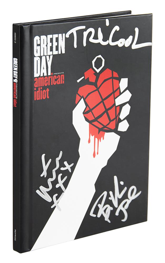 American Idiot deluxe CD/hardcover book package, signed on the front cover in silver ink by Billie Joe Armstrong, Mike Dirnt, and Tre Cool. In fine condition. The CD is included.