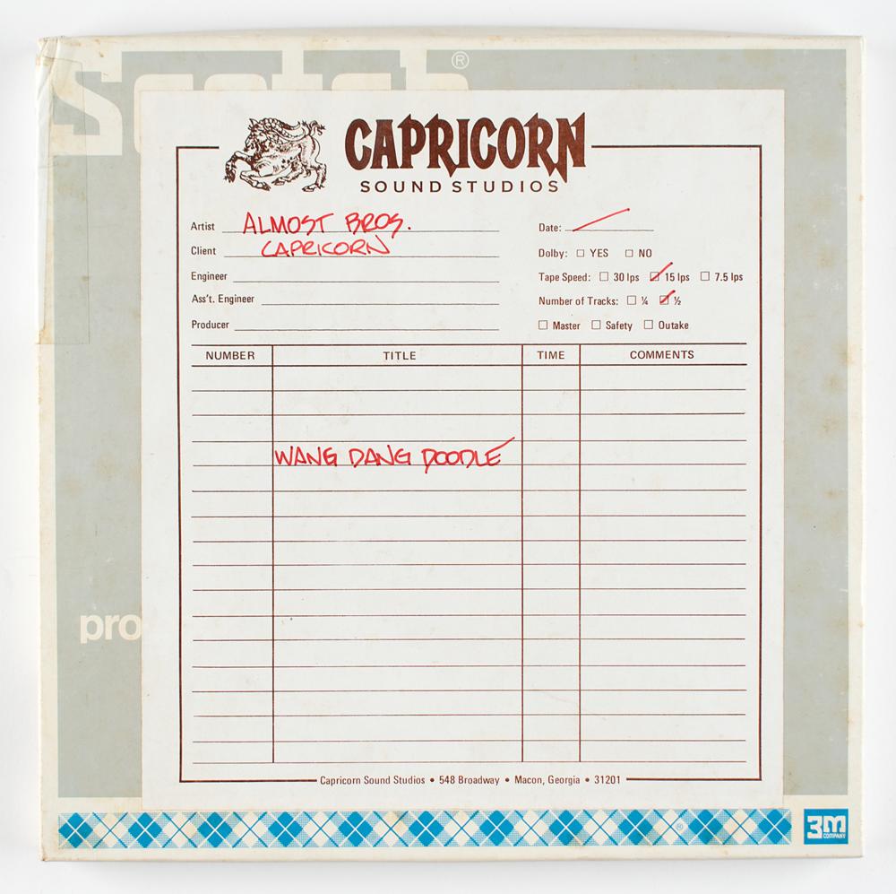 Remarkable collection of nine demo tapes originating from the Capricorn Records warehouse once owned by Phil Walden, co-founder of the independent label based in Macon, Georgia. Capricorn Records is often credited by music historians as creating the southern rock genre, with the Allman Brothers Band as its leading group. These tapes represent various iterations of the band, including the Allman Joys (led by Duane Allman and Gregg Allman), the Almost Bros. (their old roadies recordings), and the Allman Bros.