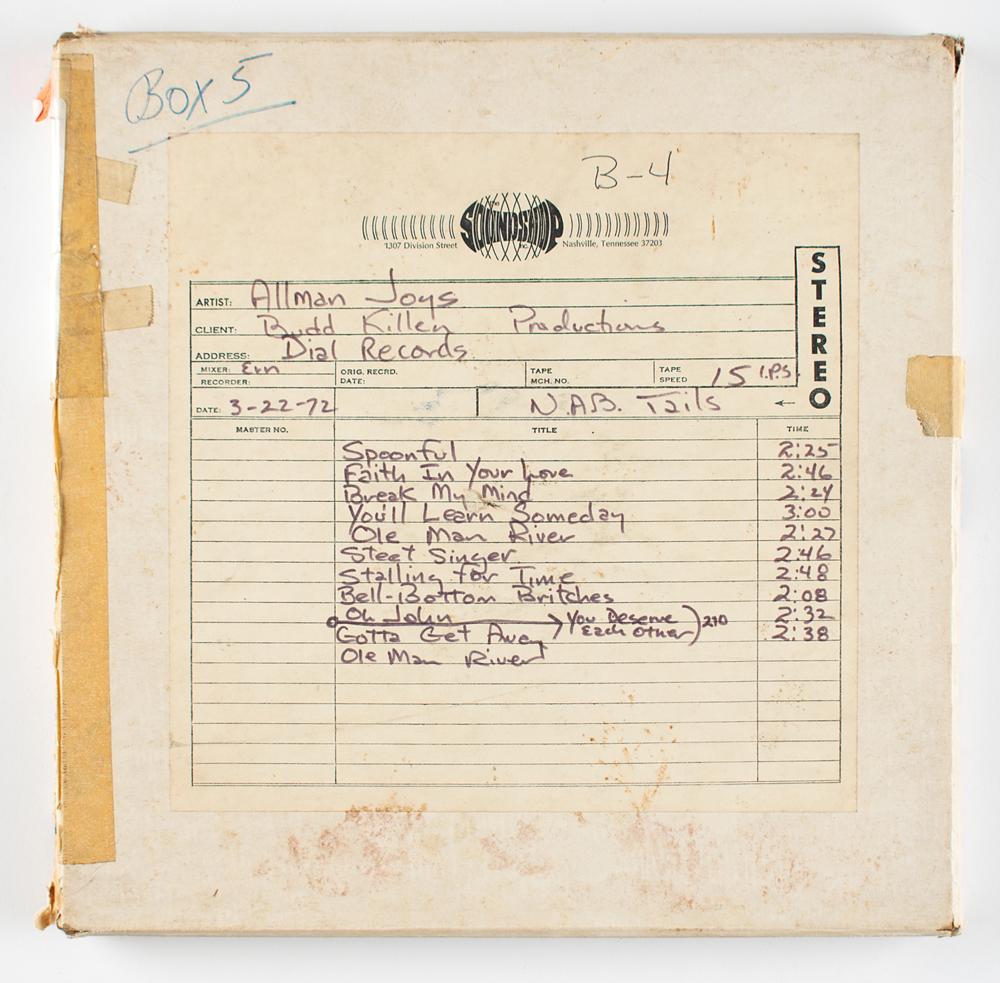 2. "Allman Joys," dated March 22, 1972, listing twelve tracks, highlighted by "Spoonful," "Break My Mind," "You'll Learn Someday," "Bell-Bottom Blues," "Gotta Get Away," and "Ole Man River."