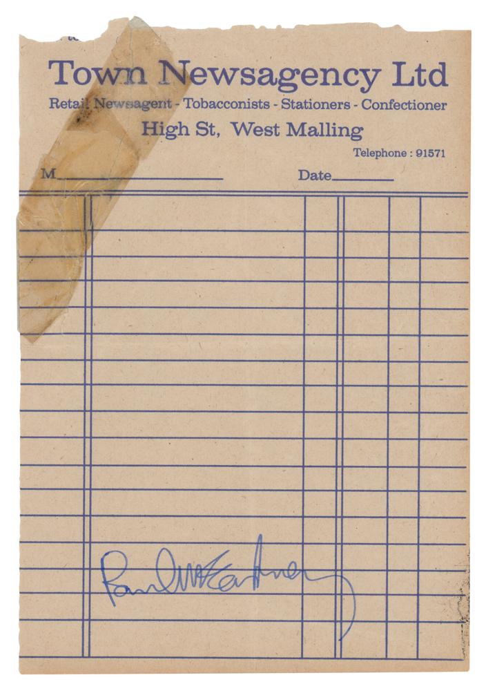 Neat vintage ink signature, "Paul McCartney,” on an off-white 5 x 7.25 inventory sheet from Town Newsagency Ltd., of West Malling, Kent, England. In very good to fine condition, with overall creasing, and an old repaired tear to the upper left corner. This signed inventory sheet represents a fascinating little piece of Beatles history—the Town Newsagency at 90 High Street in West Malling, Kent, was used as a ticket shop during the opening of the Beatles’ 1967 film Magical Mystery Tour; on September 22, 1967, Ringo Starr was filmed entering a shop and buying tickets for the tour from John Lennon, who was sporting a giant fake mustache.