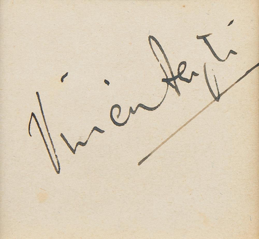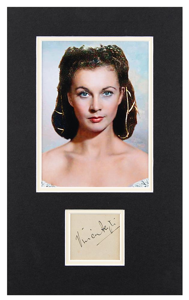 Fountain pen signature, "Vivien Leigh,” on an off-white 2.5 x 2.25 sheet. Double-matted with a color photo of the actress to an overall size of 9 x 14.75. In fine condition.