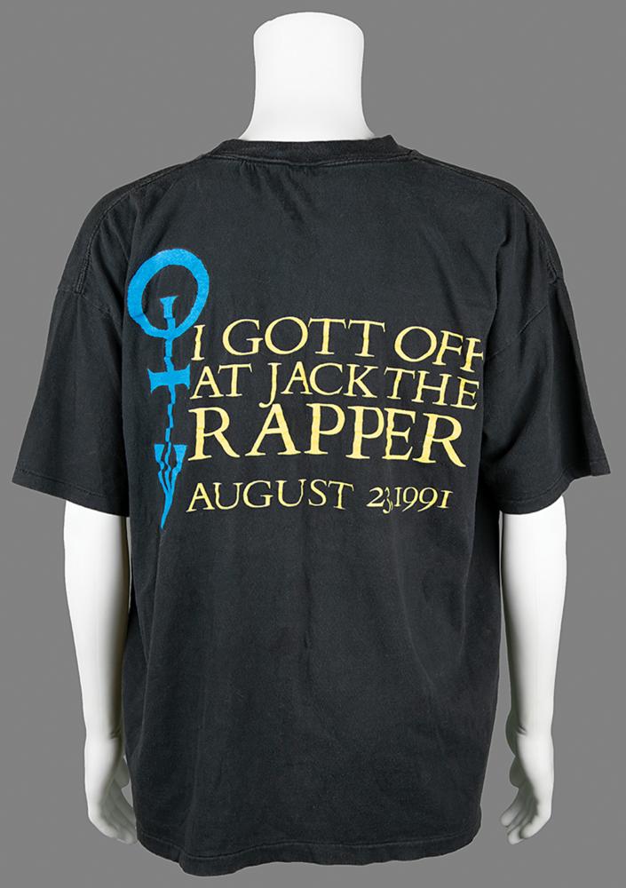 Rare and very limited edition black short-sleeve t-shirt from a music industry party at the Jack the Rapper 'Family Affair' convention on August 23, 1991, "one size fits all" but likely size XL, featuring a blue Prince symbol on the front with yellow text, "Prince & The New Power Generation," and a similar design on the back, reading, "I Gott Off at Jack the Rapper, August 23, 1991." In very good to fine condition, with overall wear and a slight stain to the front.