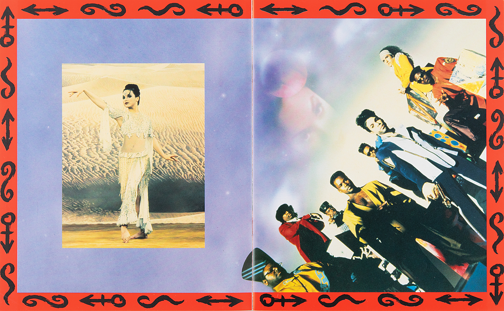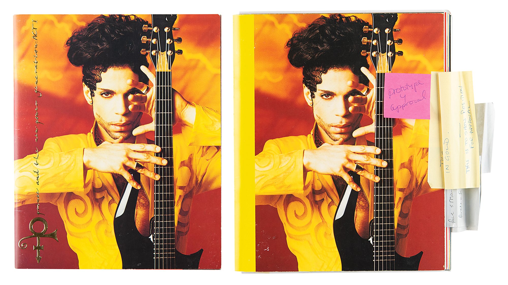 Fascinating original program prototype for Prince & the New Power Generation's 1993 Act I Tour, 9 x 11, featuring all pages printed on single-sided sheets, with post-it notes throughout to indicate various changes and amendments. Includes a final version of the program as printed for the tour, incorporating these changes throughout. Among these notes are: "The logo and type will be embossed in gold" on the front cover; a correction for a incorrect blue-toned group image; changing white symbols to a black gloss varnish; and changing portraits from gold-tone to black-and-white. In fine condition. A unique work-in-progress piece, plus the final version as published for Prince's 1993 Act I Tour.