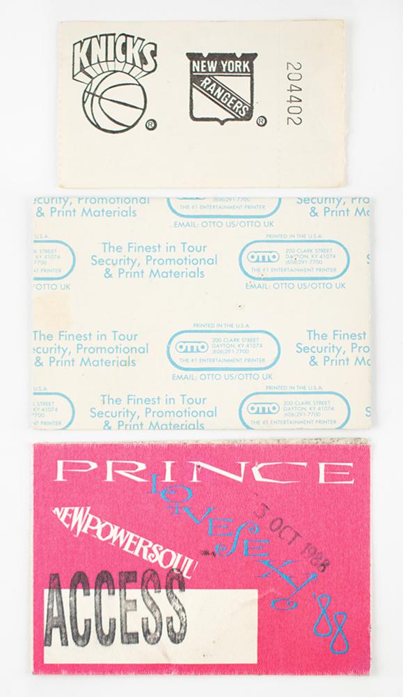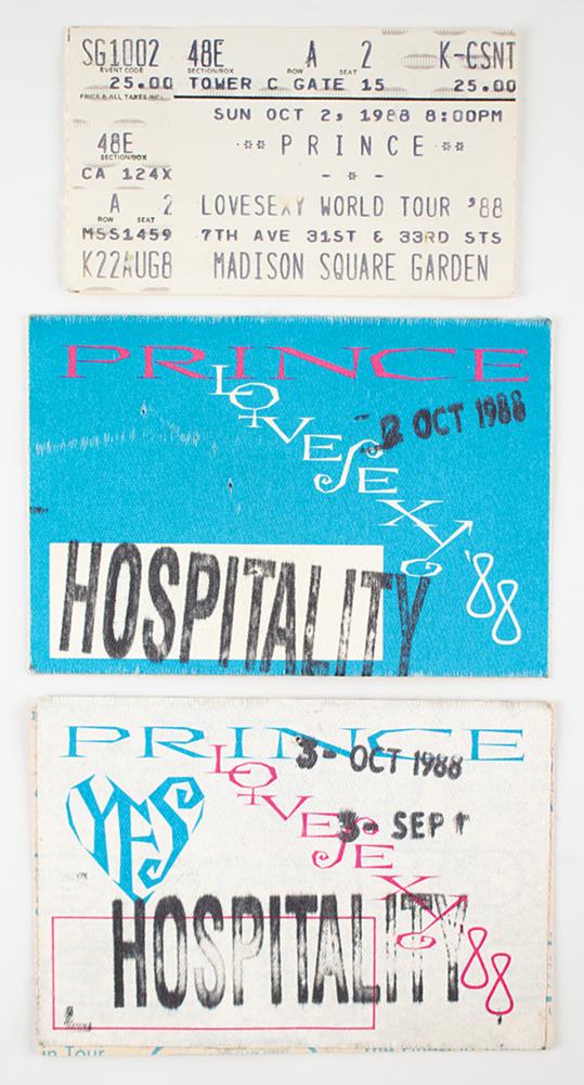 Five Lovesexy items: a Lovesexy cassette tape; a ticket stub for Prince's concert at Madison Square Garden on October 2, 1988; and three cloth backstage passes from the Lovesexy Tour, two stamped "Hospitality" and one "Access." In very good to fine condition, with the "Access" and white "Hospitality" passes affixed back-to-back.