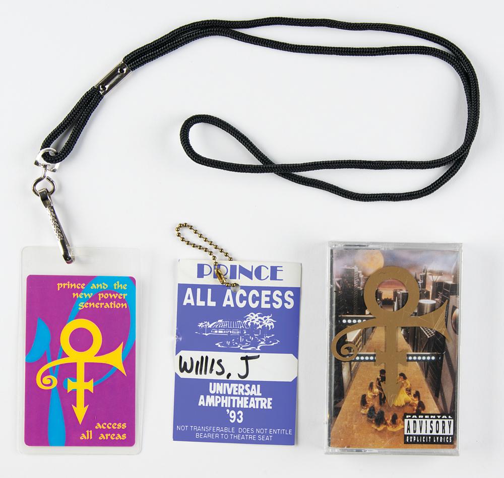 Brand-new shrinkwrapped cassette tape of Prince's 1992 album known as Love Symbol, plus a laminated all-access pass for Prince and the New Power Generation's 1993 tour, and an all-access pass for Prince's "Act I" show at the Universal Amphitheatre in April 1993. In overall fine condition.