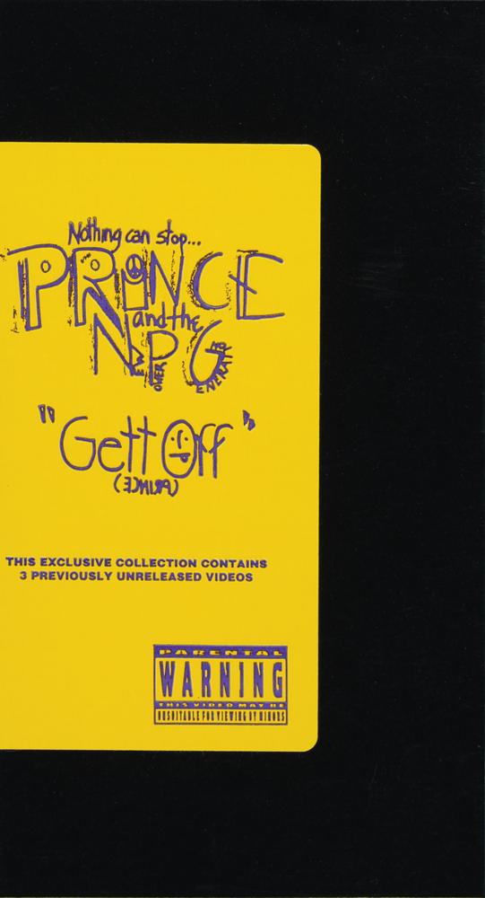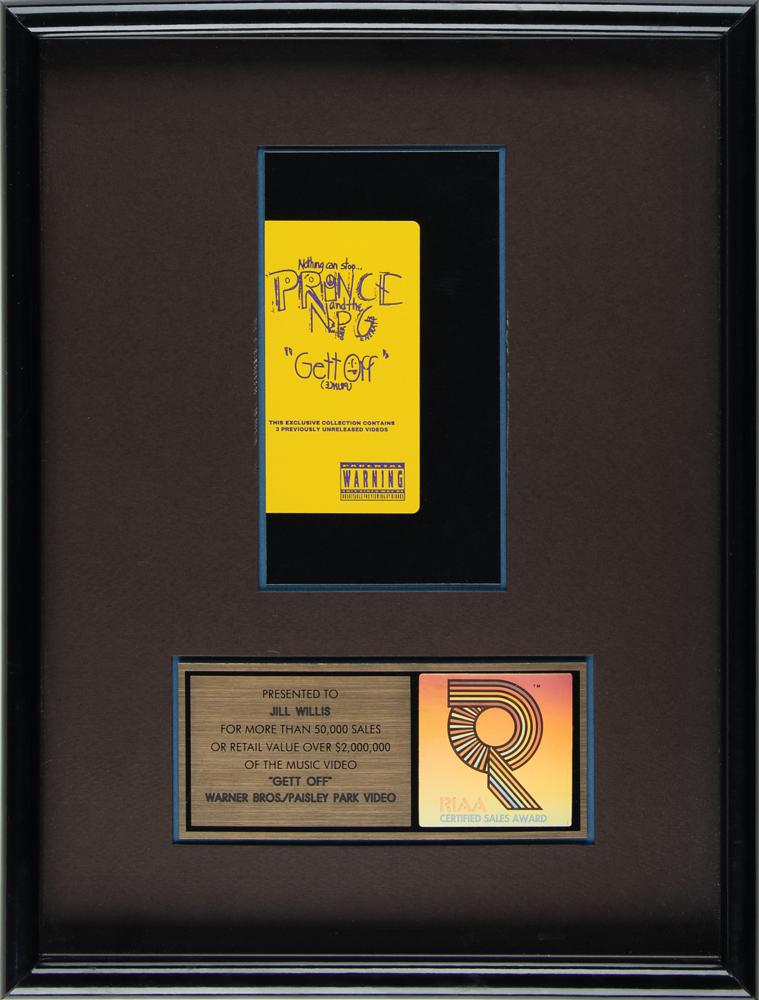 Official ‘R’ hologram-style RIAA gold sales award presented "to Jill Willis for more than 50,000 sales or retail value over $2,000,000 of the music video 'Gett Off,' Warner Bros./Paisley Park Video." Framed with its plate and VHS box cover to an overall size of 13 x 17. Award retains its backing with affixed Fitzgerald Hartley Marketing label. In fine condition. Prince & the New Power Generation's long-form 'Gett Off' music video was certified gold on November 13, 1991.