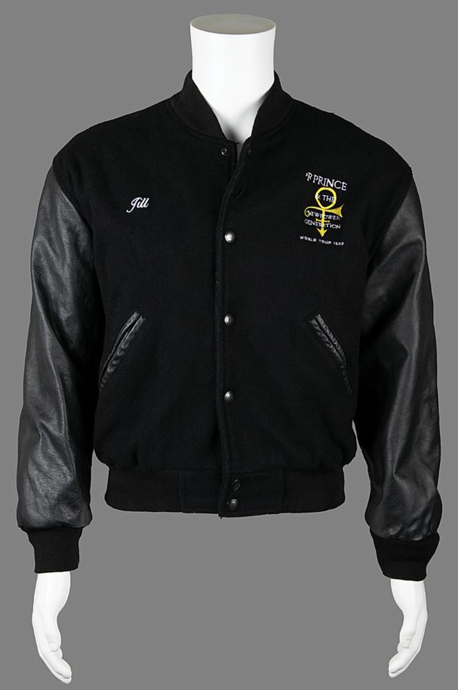 Appealing bomber jacket from Prince's 1992 Diamonds and Pearls World Tour, size (unisex) small, embroidered on the front with a Prince & the New Power Generation emblem and the tour member's name, "Jill," and on the back with a large Prince symbol. The warm jacket has an 80% wool body and 100% leather sleeves, with a polyester fill. In fine condition.