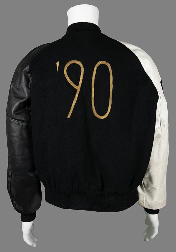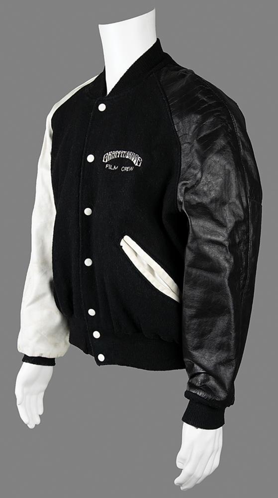 Black-and-white wool-and-leather official crew jacket made by DeLong, size 44, embroidered on the left breast with silver text, “Graffiti Bridge, Film Crew,” with the year on the back in gold, "’90." Includes a laminated Graffiti Bridge set access pass issued to Jill Willis, signed by production coordinator Julie Hartley. In very good to fine condition, with moderate wear and light soiling to the white sleeve.
