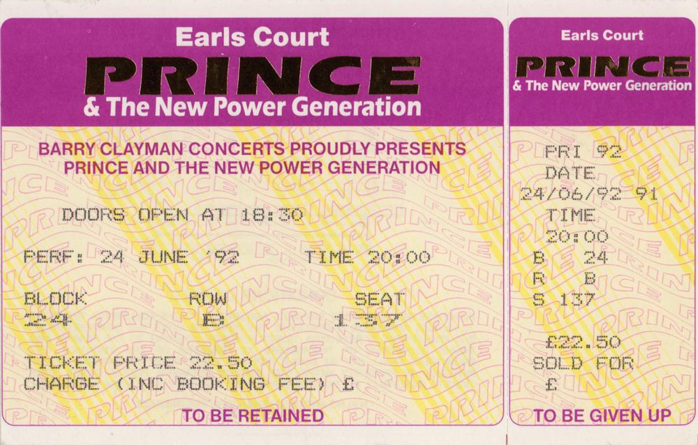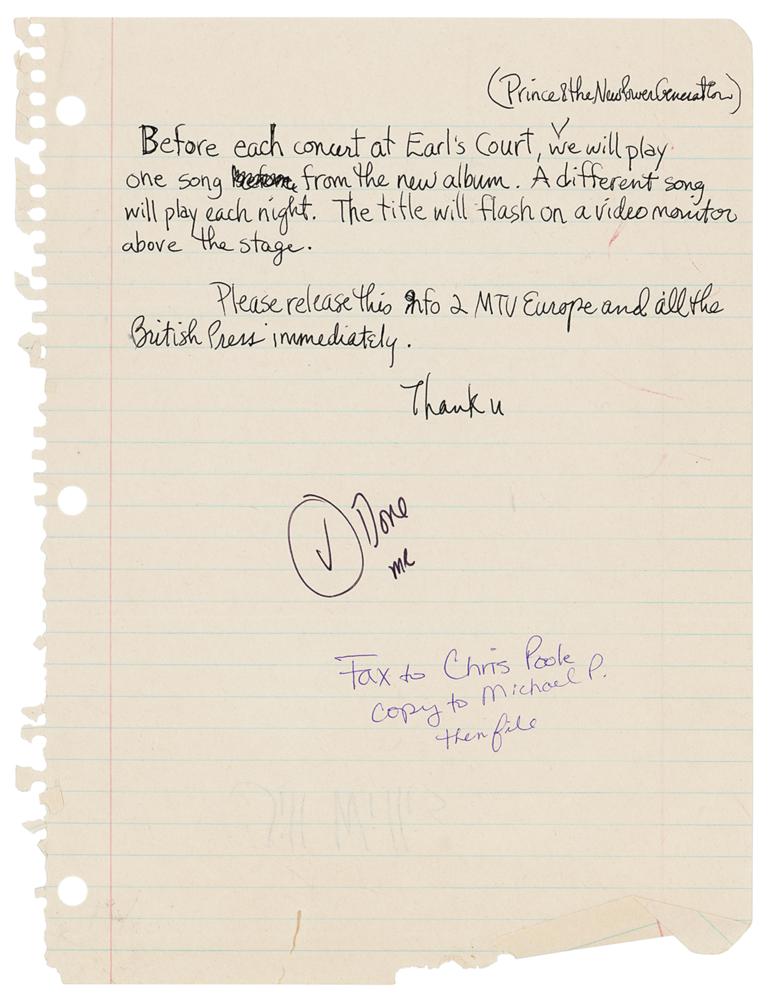 Handwritten instructions by Prince for his concerts at Earls Court in London (June 15-24, 1992) during the Diamonds and Pearls Tour, one page, 7.75 x 10.5, signed in the upper right corner, "(Prince & the New Power Generation)." Prince writes, in full: "Before each concert at Earl's Court, we will play one song from the new album. A different song will play each night. The title will flash on a video monitor above the stage. Please release this info 2 MTV Europe and all the British press immediately. Thank u." In fine condition, with creasing along the bottom edge. Accompanied by a full ticket for the last Earls Court show on June 24th.
