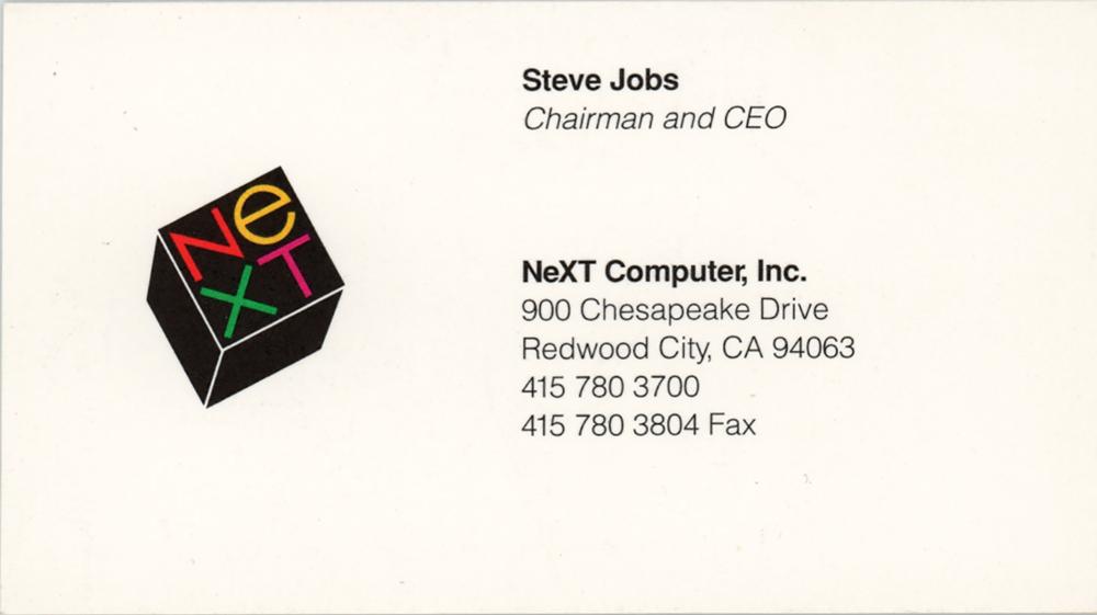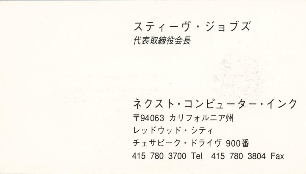 Scarce circa early 1990s NeXT Computer, Inc. business card of Steve Jobs, 3.5 x 2, listing him as "Steve Jobs, Chairman and CEO." The off-white card boasts NeXT's iconic logo designed by Paul Rand, and gives the address of the company's headquarters as "900 Chesapeake Drive, Redwood City, CA 94063." The reverse is imprinted in Japanese with the same information. In very fine condition.
