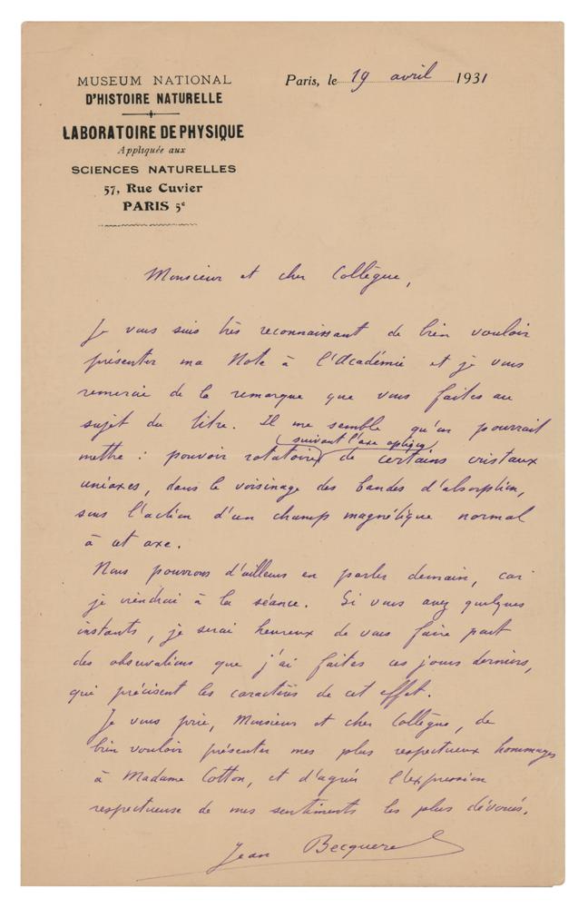 French physicist (1878-1953) who worked on a range of experimental physics topics including magnetic effects on the optical properties of materials and the effects of low-temperature on magnetic susceptibility; the son of Henri Becquerel. ALS in French, one page, 5.25 x 8.5, Museum National d'Histoire Naturelle letterhead, April 19, 1931. Handwritten letter to a colleague, evidently fellow physicist, Aimé Auguste Cotton (1869-1951), in part (translated): "I am very grateful to you for presenting my message to the Academy, and I thank you for your remarks about the book. It would seem to me that one could posit: rotational power along the optical axis of certain uni-axis crystals, near the absorption bands, subject to the action of a magnetic field normal to that axis. We can talk about this tomorrow, by the way, because I will be coming to the meeting. If you have a few moments, I will be happy to share the observations with you that I have made over the past few days and that will render the properties of this effect more precise. Please give my kindest regards to Madame Cotton." In fine condition.