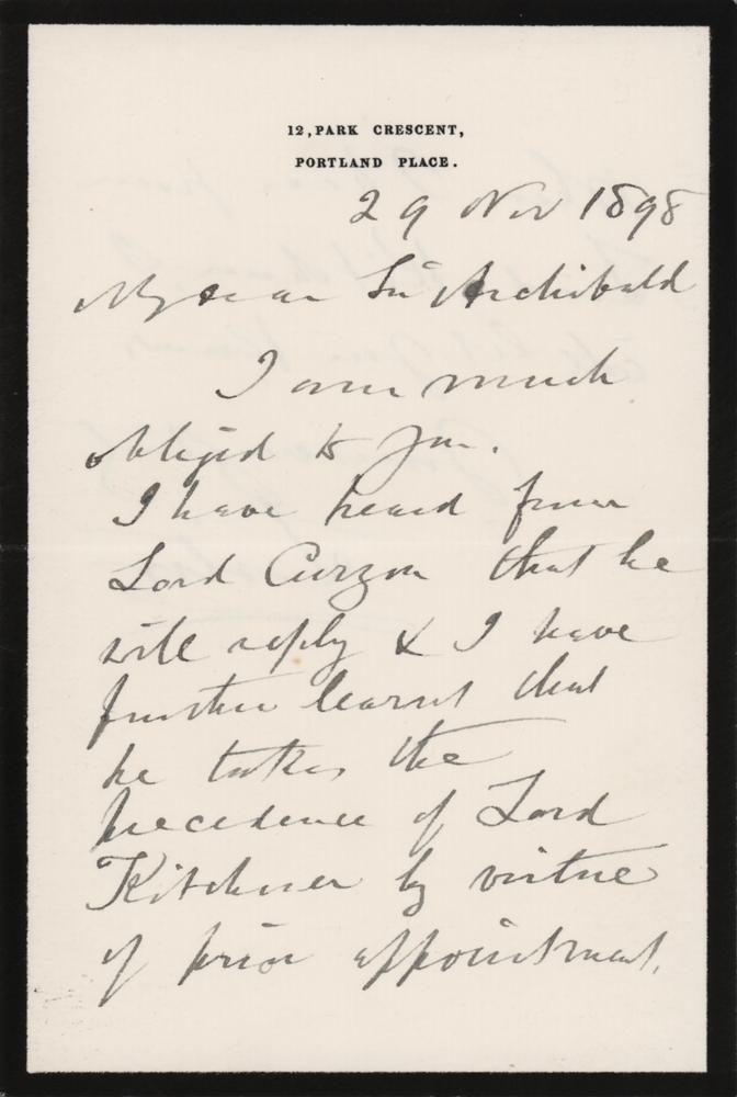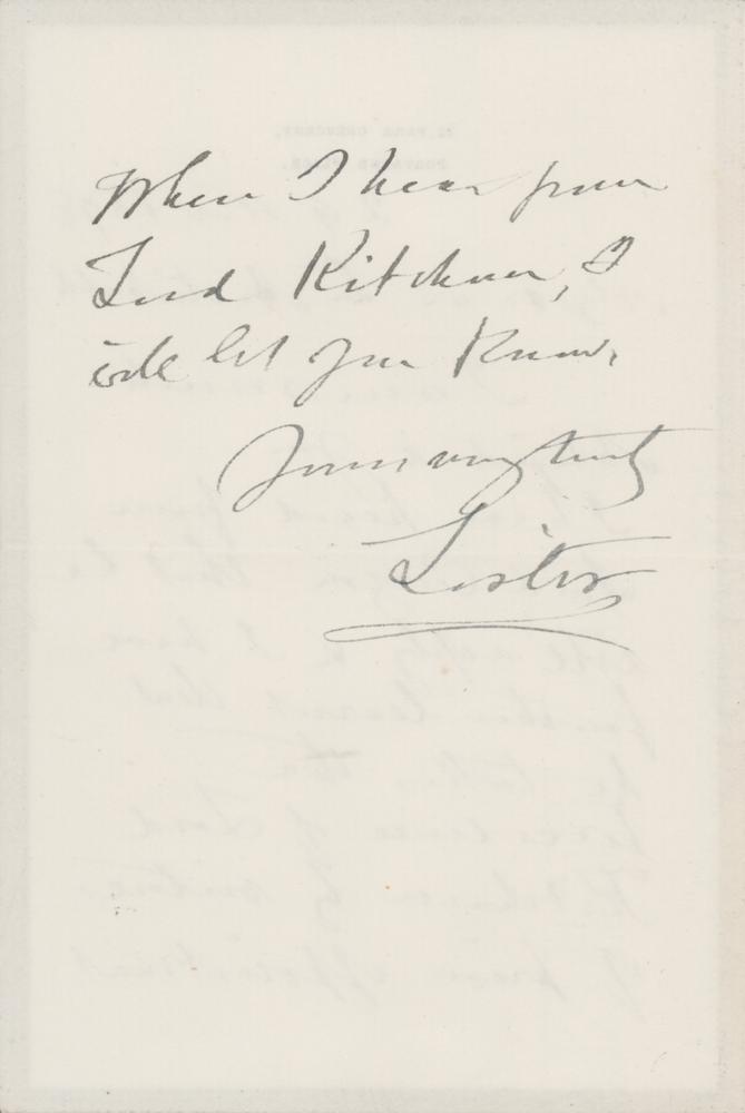 British surgeon (1827-1912) who pioneered the practice of sterile surgery, one of the most important medical advances of the day. ALS signed “Lister,” one page, 4 x 6, black-bordered personal letterhead, November 29, 1898. Handwritten letter to Archibald Geikie (1835-1924), prominent Scottish geologist who investigated much of the British Isles and worked on volcanic activity. In full: "I am much obliged to you. I have heard from Lord Curzon that he will reply & I have further learnt that he takes the precedence of Lord Kitchener by virtue of prior appointment. When I hear from Lord Kitchener, I will let you know." In very fine condition.