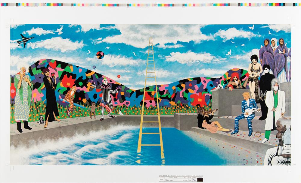 While on tour, Prince gave Henders handwritten instructions on the back pages of a tour itinerary to create an album cover painting for his forthcoming album: Around the World in a Day. Henders took Polaroid studies of Prince’s friends and his own to cast as characters in the painting, including himself in a cloud suit playing guitar.
