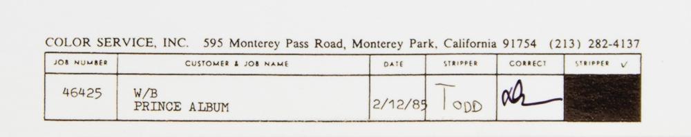 Highly desirable original color 27 x 16.5 printer's proof of the front and back cover designs for Around the World in a Day, the seventh studio album by Prince. The print features a color bar to upper border and printing legend to lower border, listing customer and job name as "W/B, Prince Album" and date as "2/12/85." The box is initialed as "Correct" by artist Doug Henders. In very fine condition.