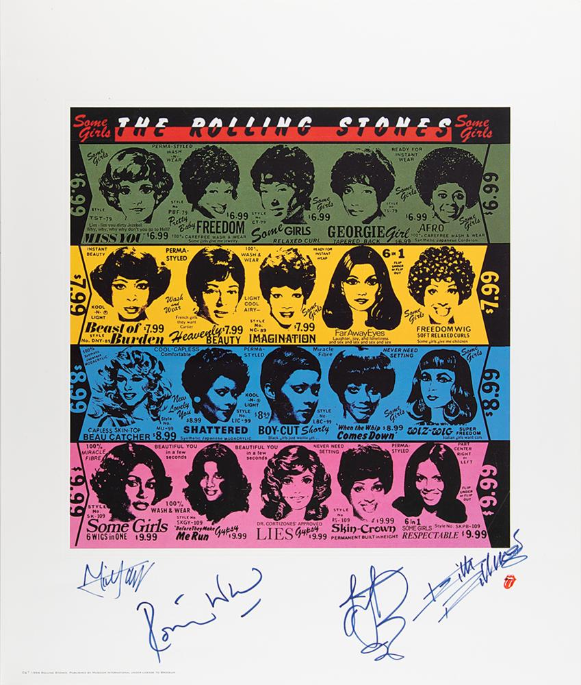 Fantastic oversized color 22.5 x 26.5 print of the cover for the Rolling Stones' 1978 album Some Girls, boldly and prominently signed in the lower border in blue felt tip by Mick Jagger, Keith Richards, Charlie Watts, and Ron Wood. Rolled and in fine condition, with a couple of light surface creases. An impressive, beautifully signed piece.