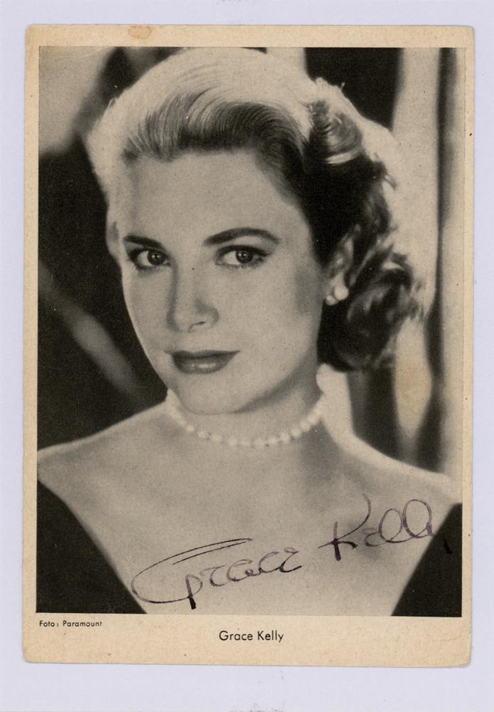 Vintage glossy 3.75 x 5.25 publicity photo of Grace Kelly wearing pearls and a black dress, signed in fountain pen. Affixed to a slightly larger mount and in fine condition. An attractive uninscribed portrait of the actress that became a princess.